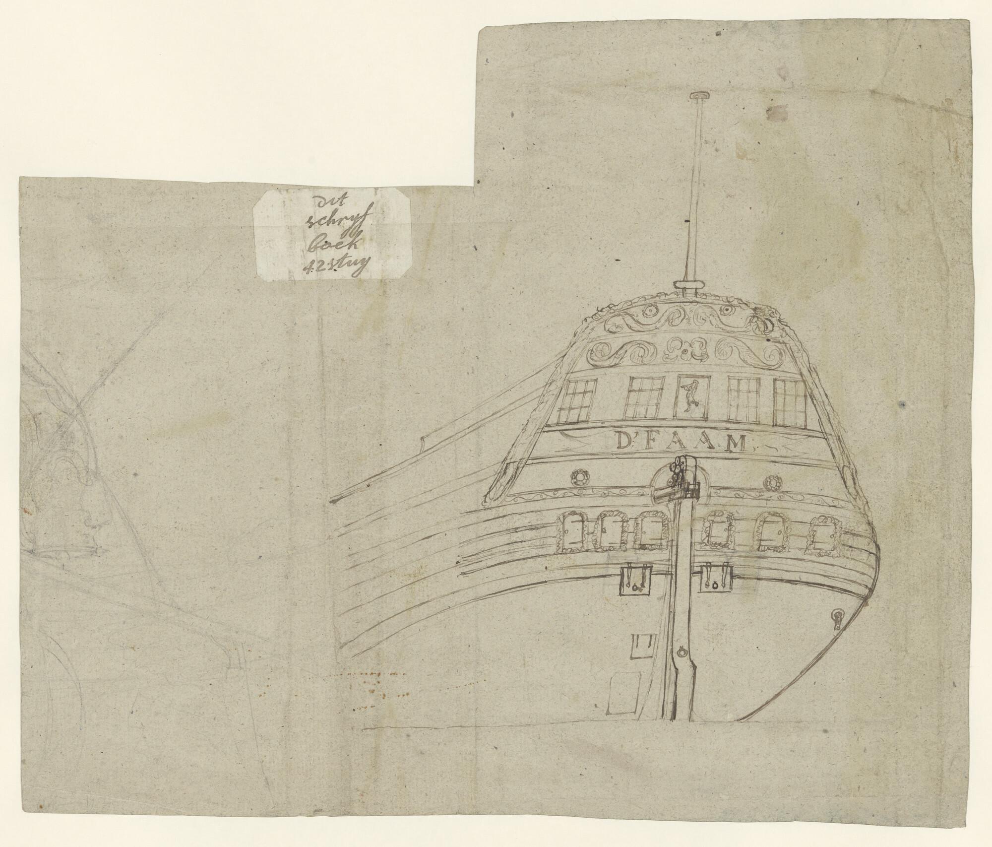 Een spiegelpaviljoenjacht. Verso: het achterschip van het schip de Faam (pentekening) en een schets van een boegbeeld.