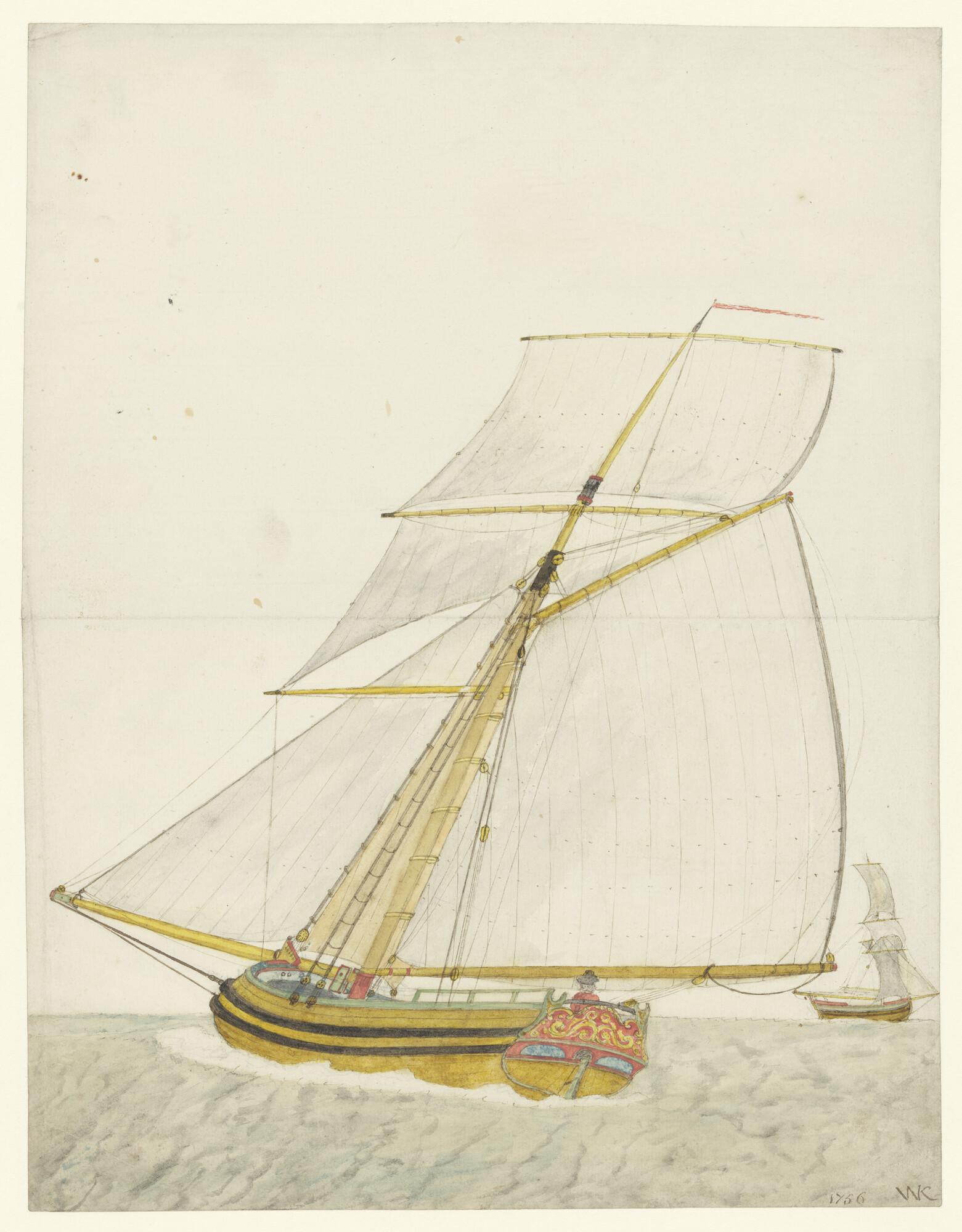Een spiegeljacht met gaffeltuig en twee topzeilen