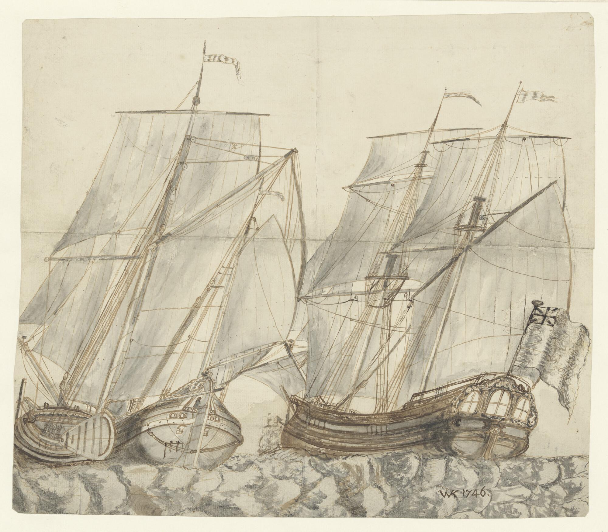 Een smakschip en een Engels jacht, gezien van bakboord achter.