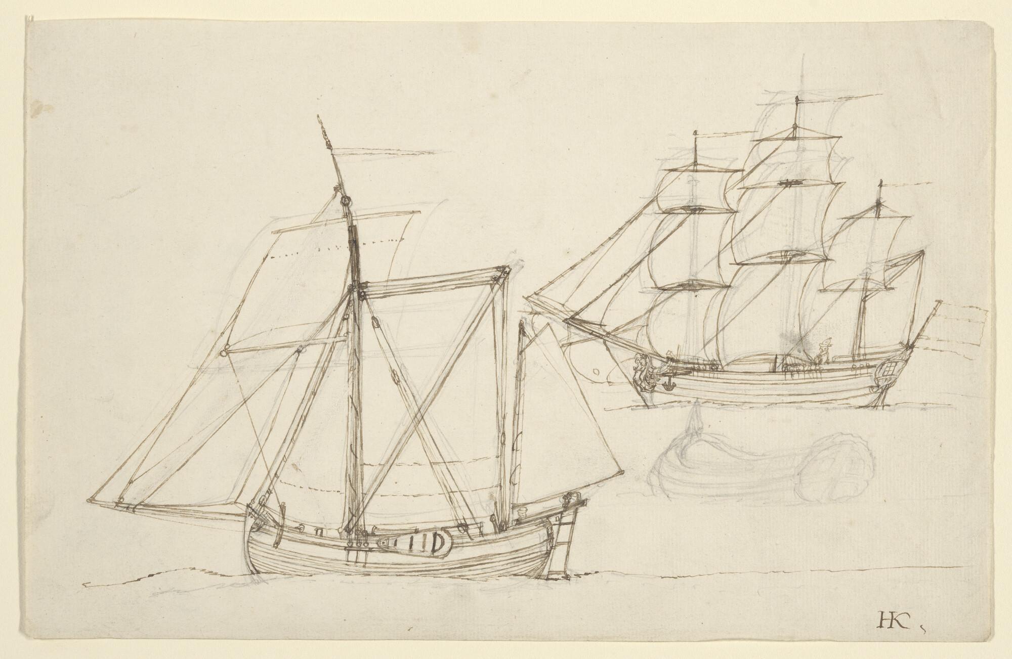 Een kofschip en een fregatschip. Verso: een driemastschip.