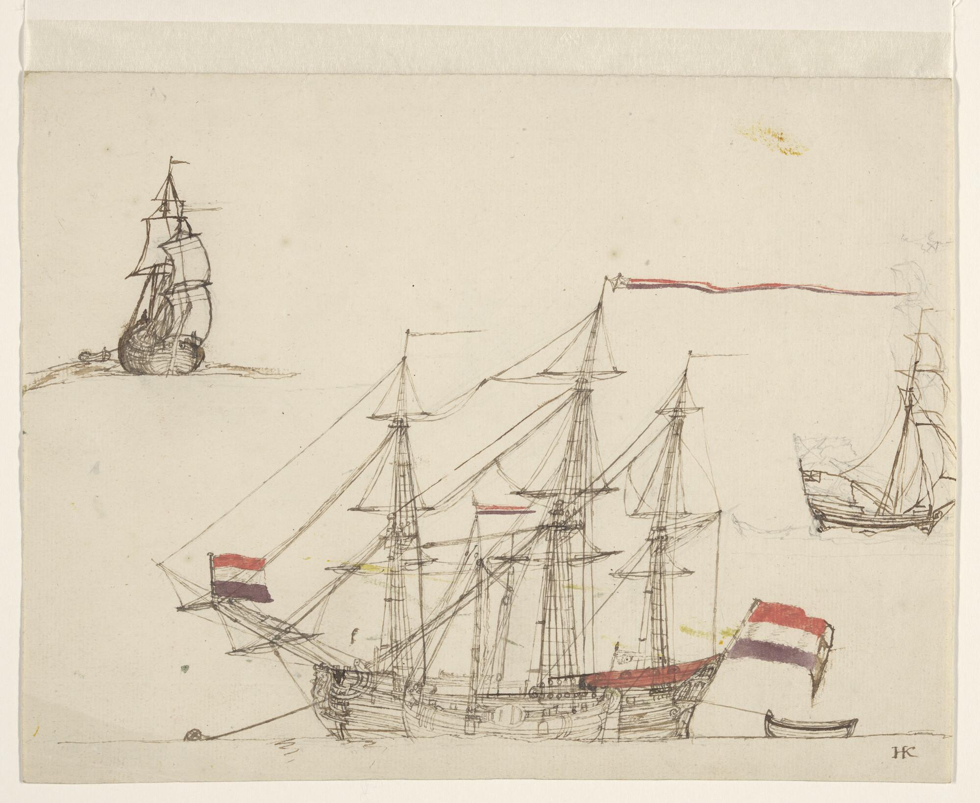 Een fregatschip met een hektjalk langszij; daarboven een buis (links) en een Engels jacht.