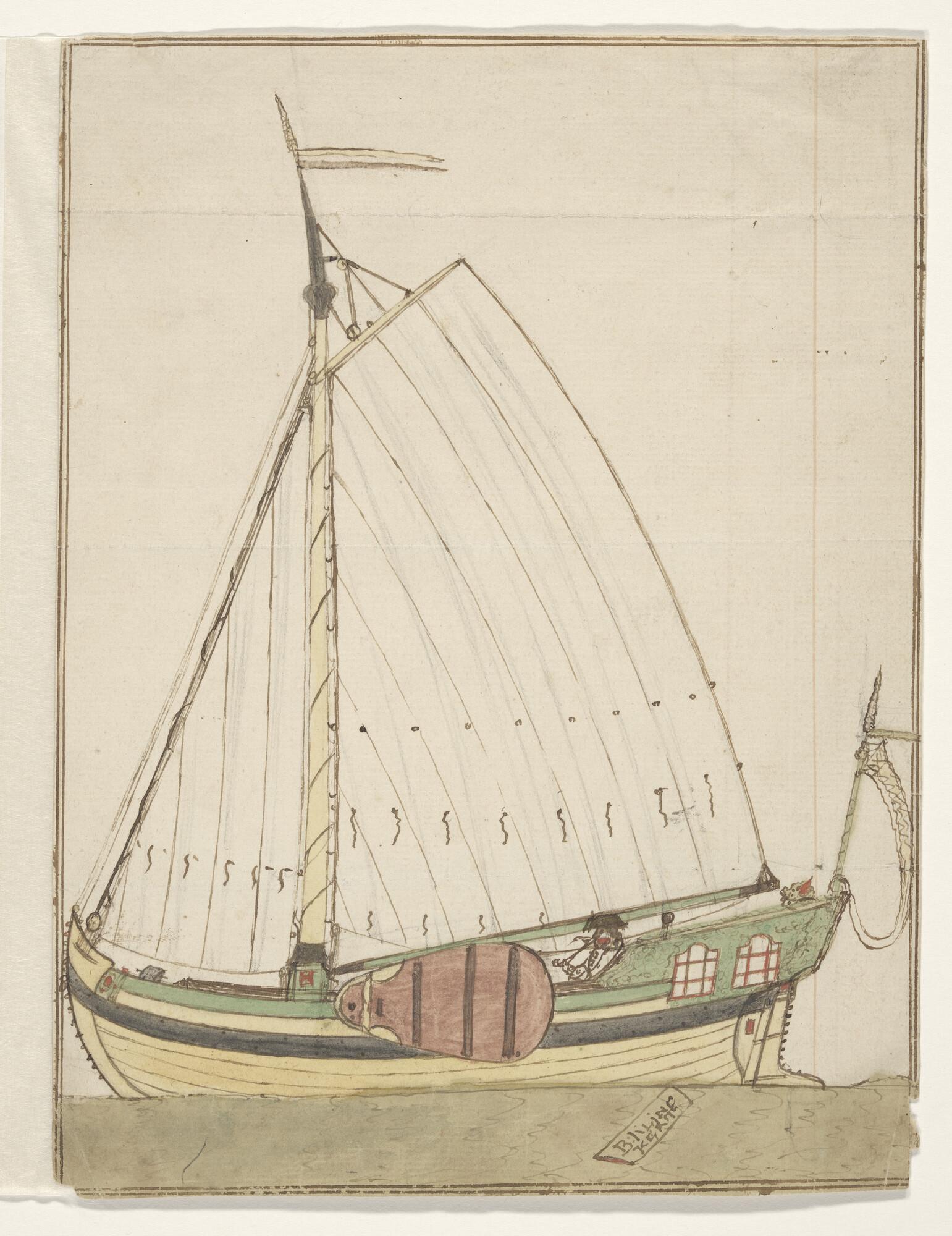 Een spiegelpaviljoenjacht met aan dek een pijprokende man