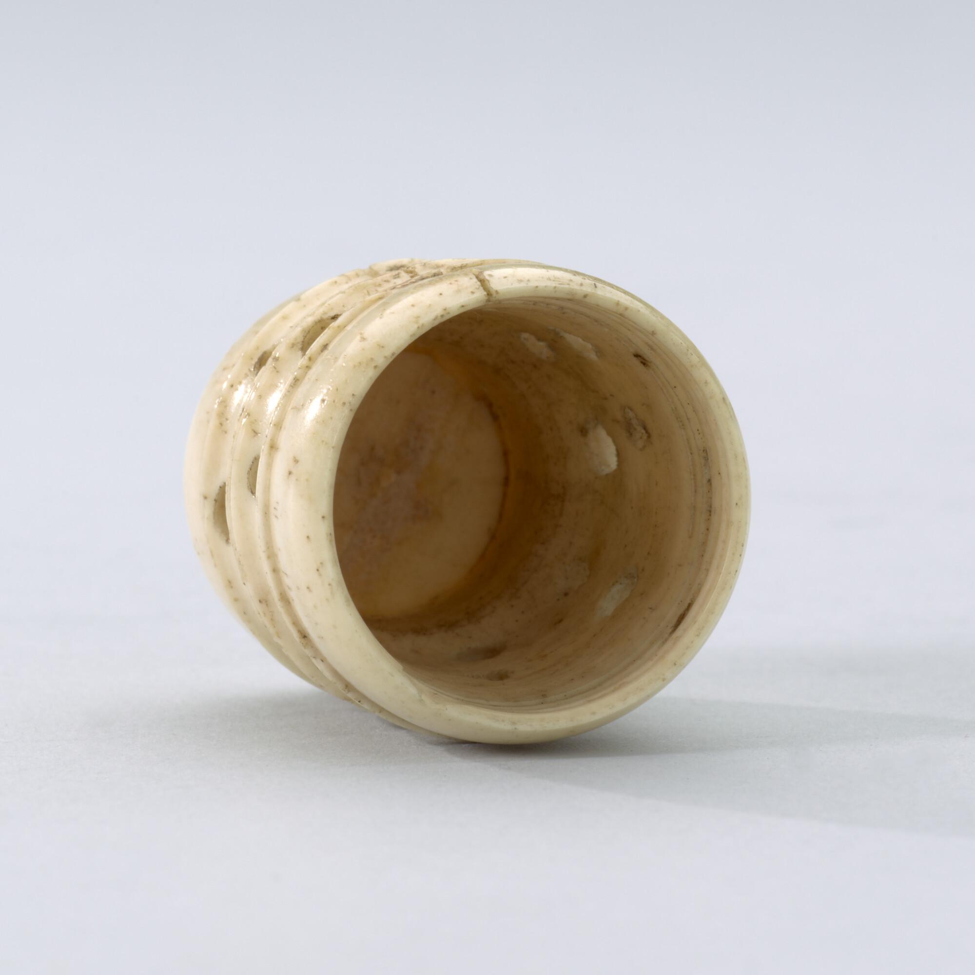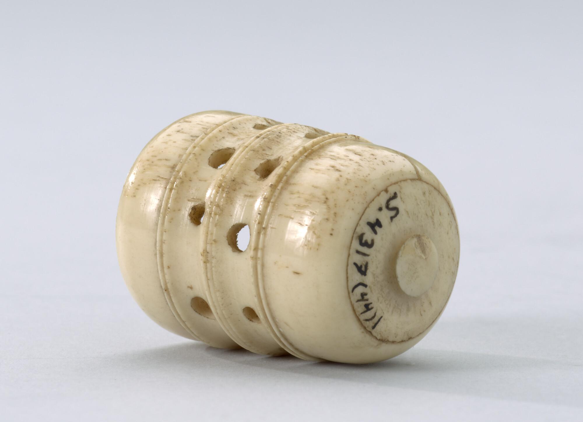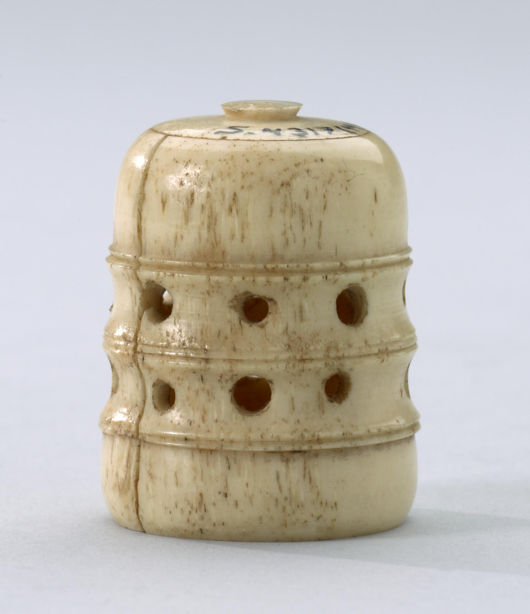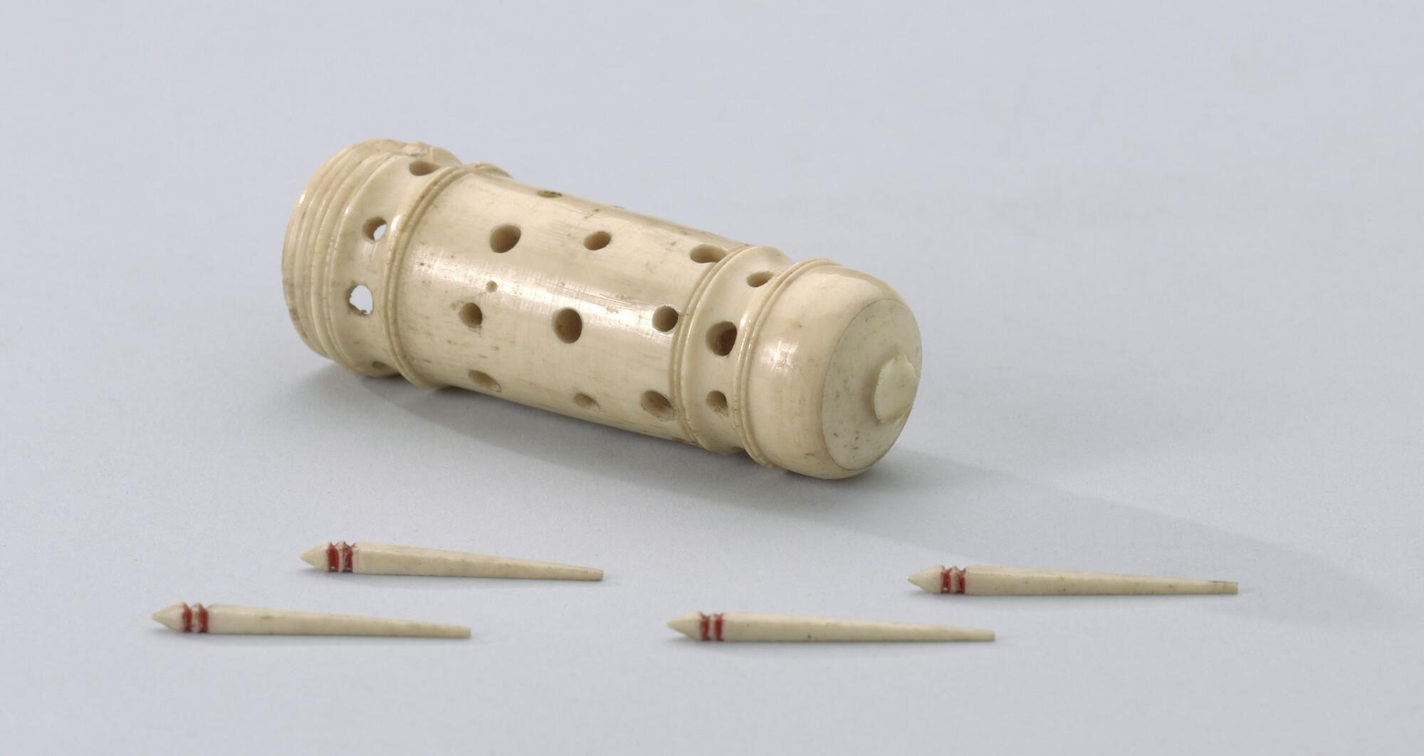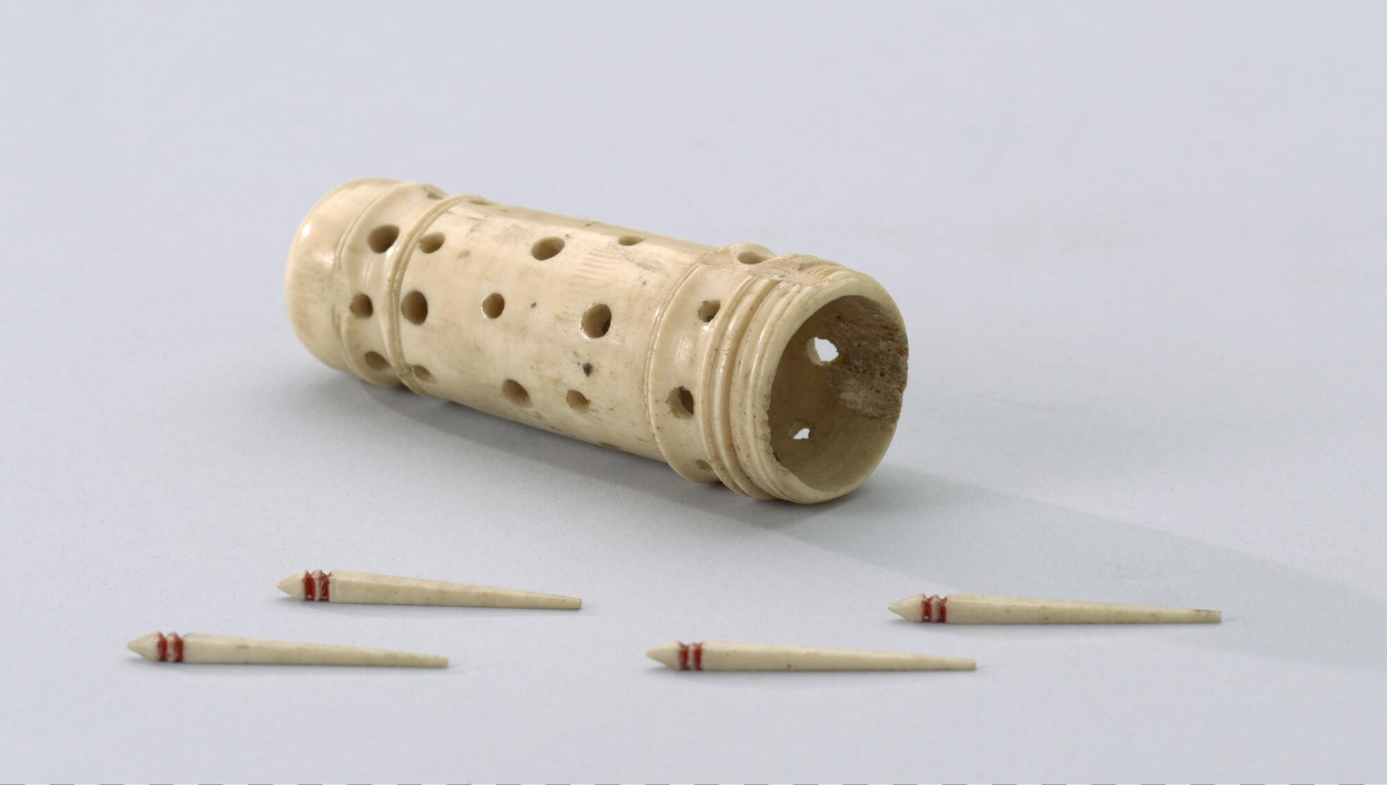 Naaldenkoker gemaakt van het bot van een potvis (Physeter macrocephalus). Twee delen. [plus vijf naalden in zakje horen waarschijnlijk hierbij]. Cilindervormig met ronde gaatjes.
