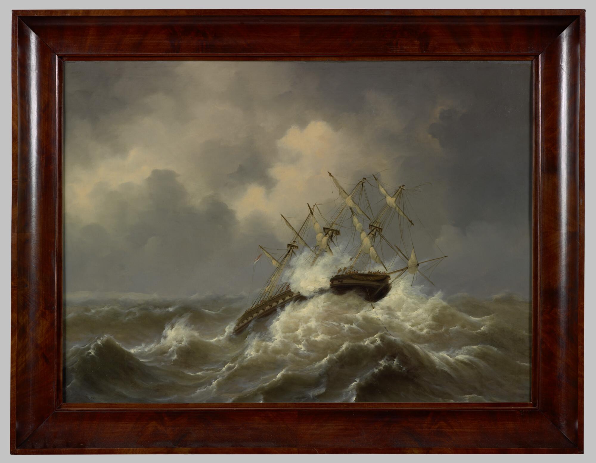 Het fregatschip Zr.Ms. Rotterdam rijdt op de rede van Texel een storm af in de nacht van 20 en 21 januari 1840.
