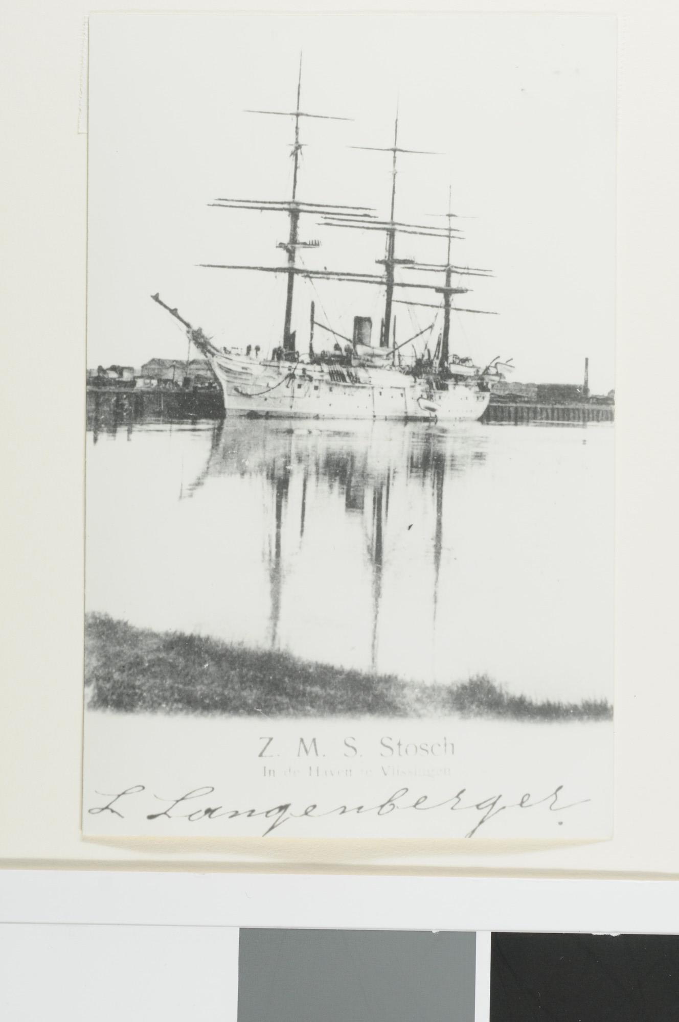 Reproductiefoto van een prentbriefkaart van het schoolschip ZMS Stosch in de haven van Vlissingen.