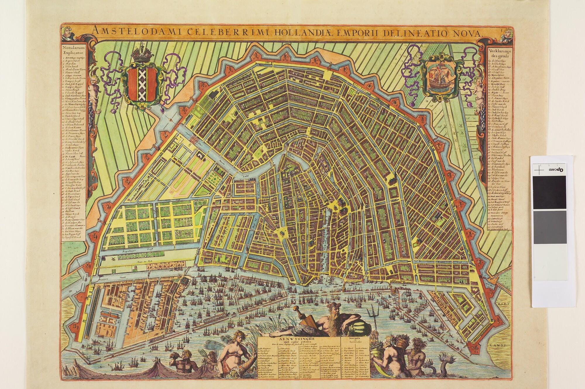 Met de hand gekleurde plattegrond van Amsterdam uit 1698 door Frederik de Wit. Uit de eerste druk van de atlas De Wit Theatrum ichnographicum omnium urbium et præcipuorum oppidorum Belgicarum XVII Provinciarium per accurate delineatarum.