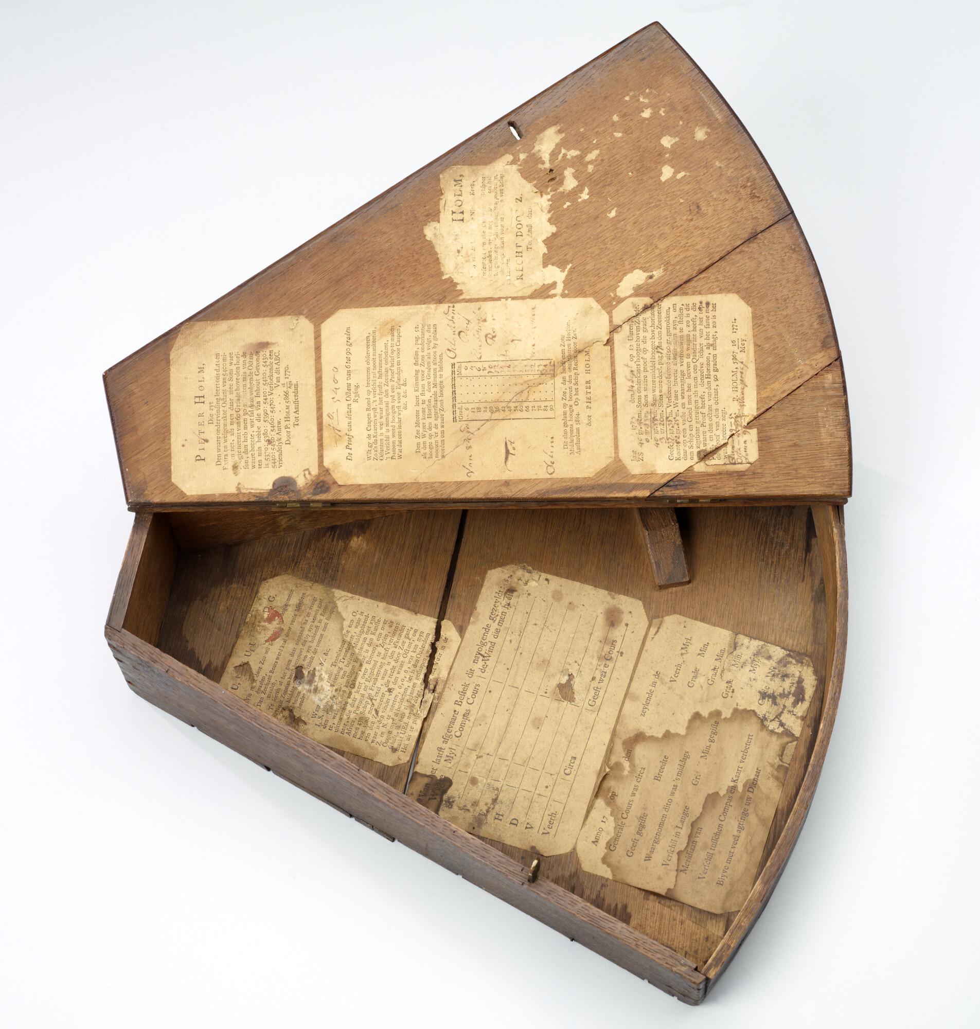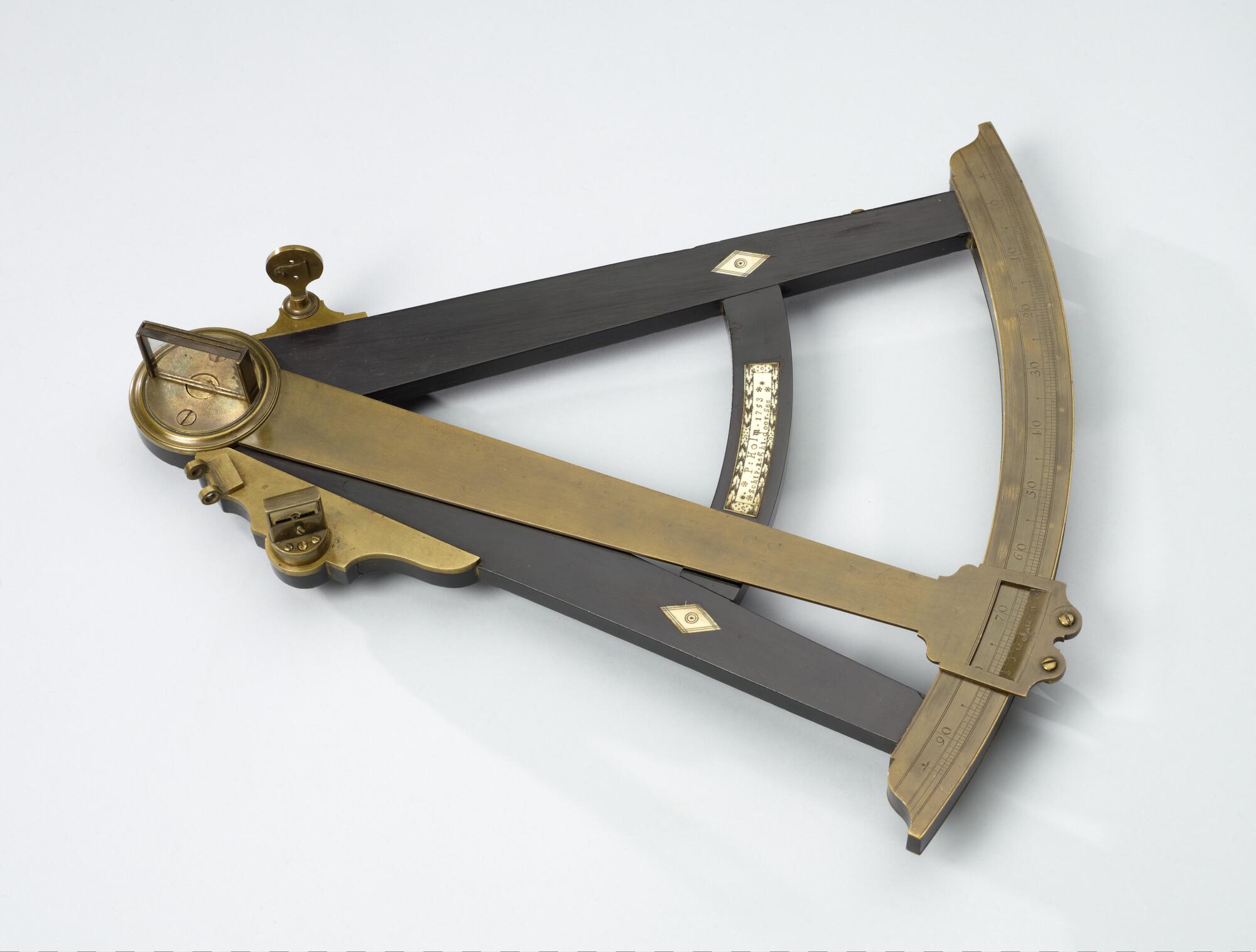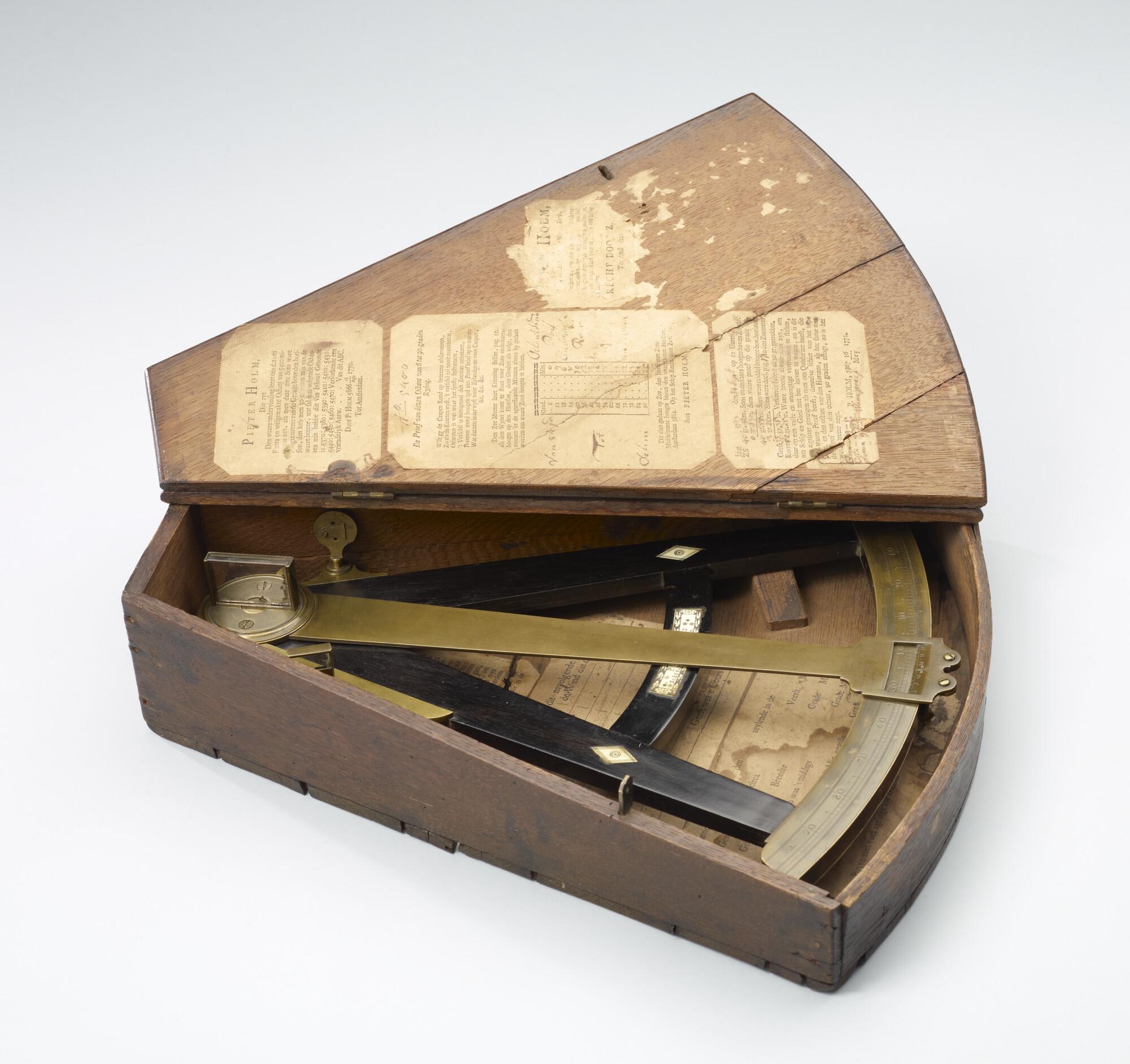 Ebbenhouten octant door Jacobus Kley, Rotterdam, 1753, gemerkt P. Holm Amsterdam. In bijbehorende houten kist waarin etiketten voor hoogtecorrecties e.d. van Pieter Holm.