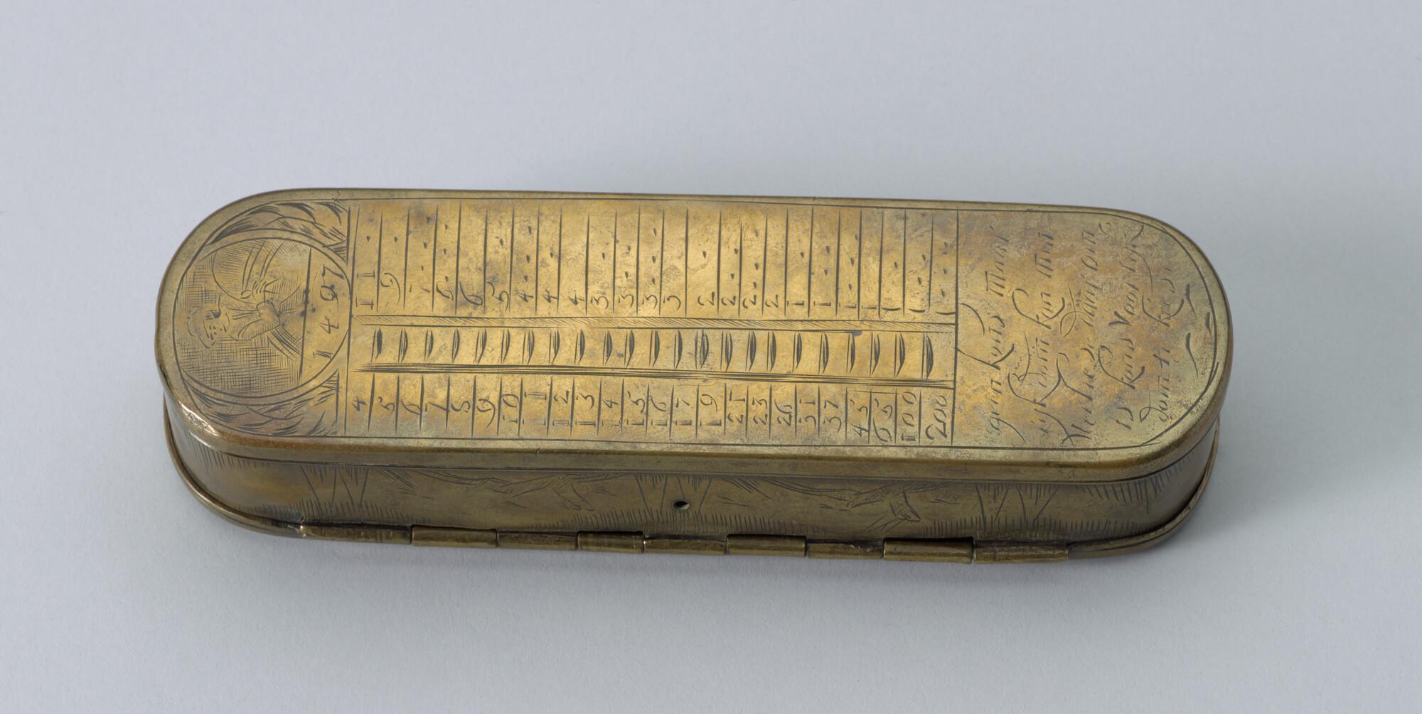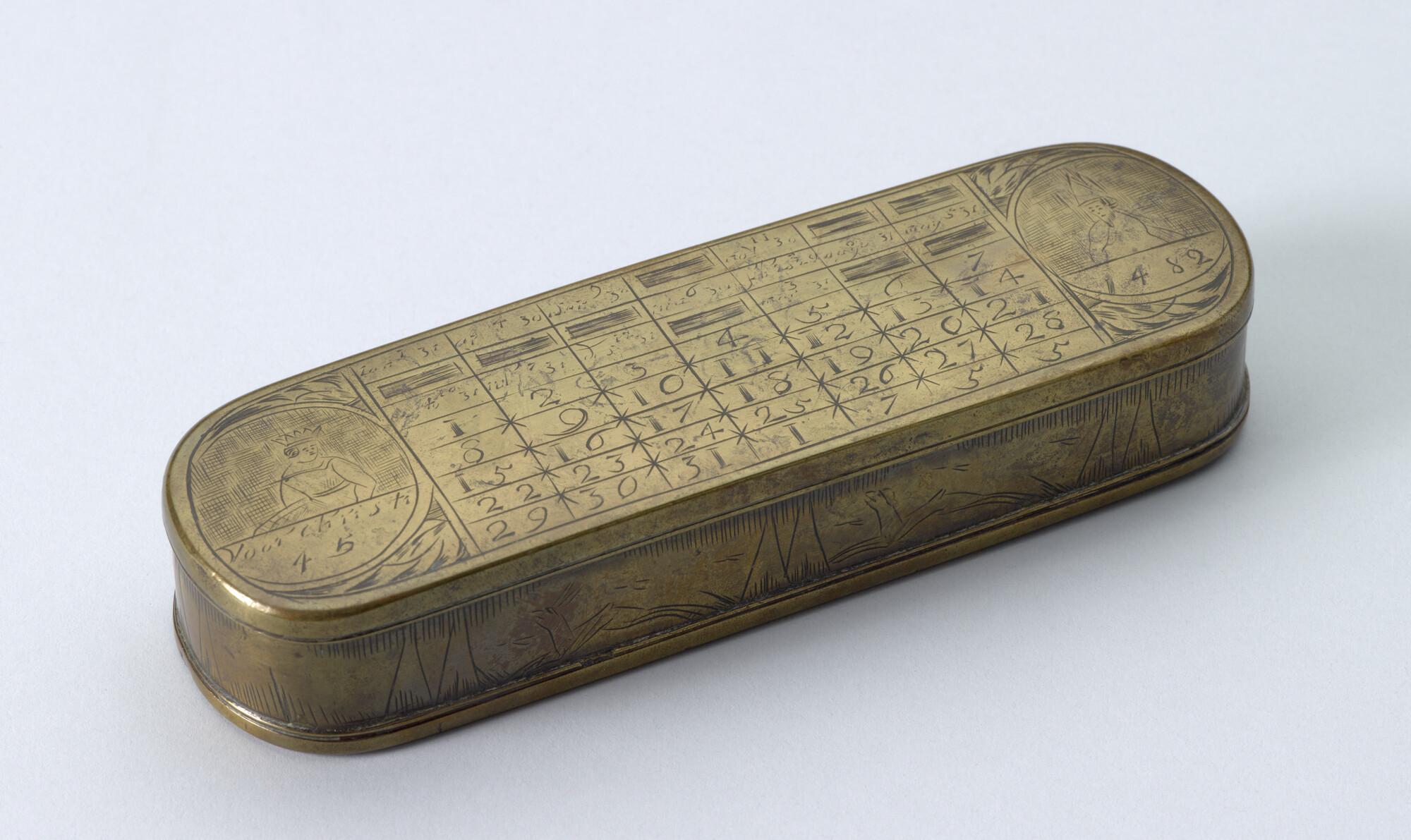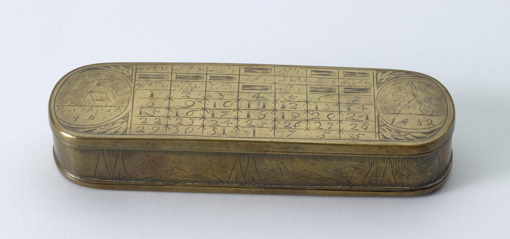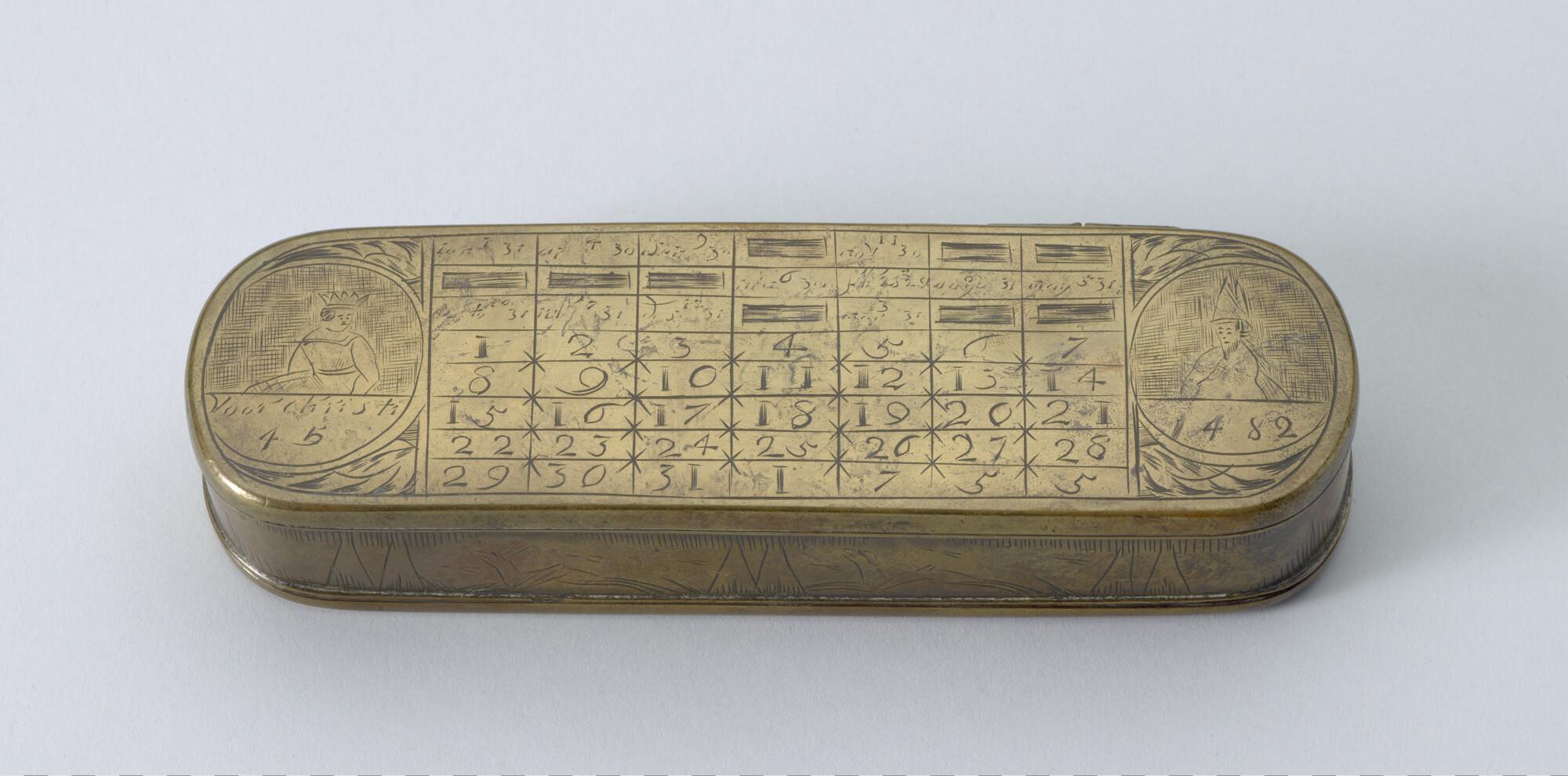 Tabaksdoos van Pieter Holm, Amsterdam, 1755. Op de voorzijde een eeuwigdurende kalender en afbeeldingen van Julius Cesar en Paus Gregorius en op de achterzijde een zeemeter en een afbeelding van Amerigo Vespucci.