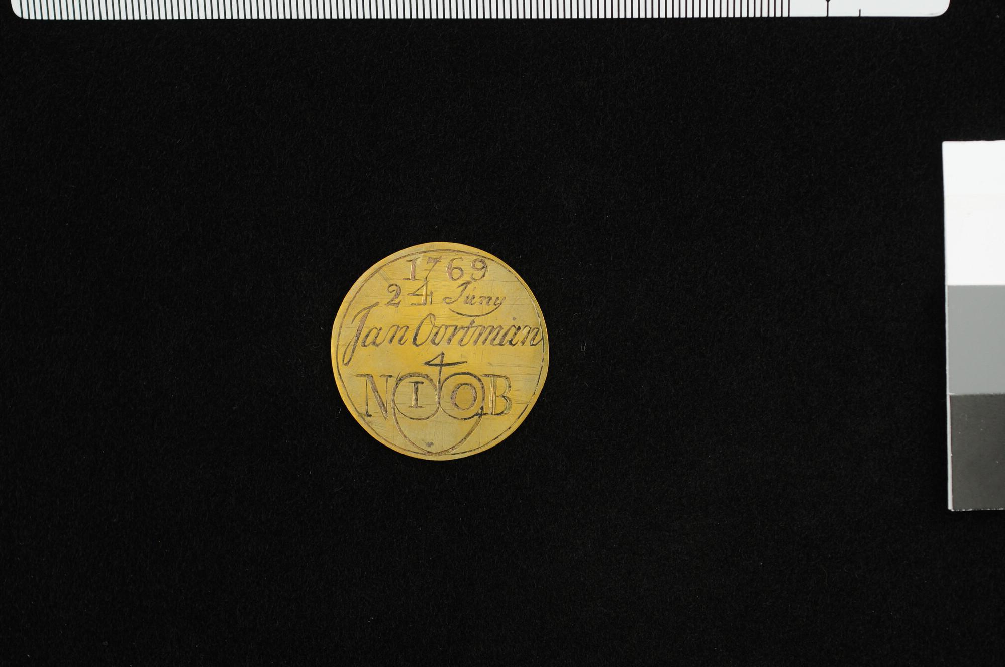 Penning van het Roei-, Steiger- en Schuitenvoerdersgilde van Amsterdam. Gildepenning van Jan Oortman, ligplaats Nieuwe Brug, 1769.