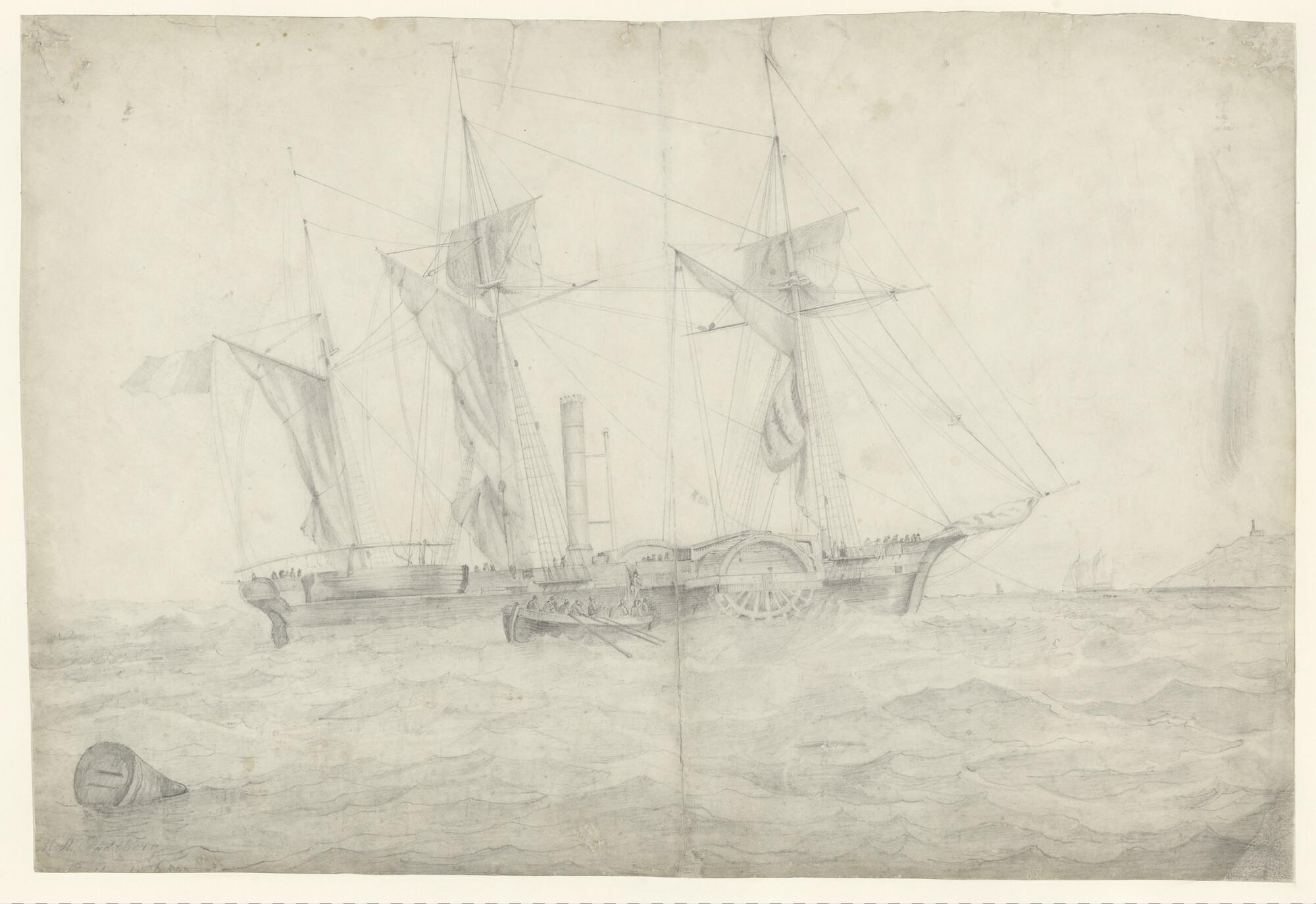 Een Frans raderstoomschip voor anker, voor het schip een sloep