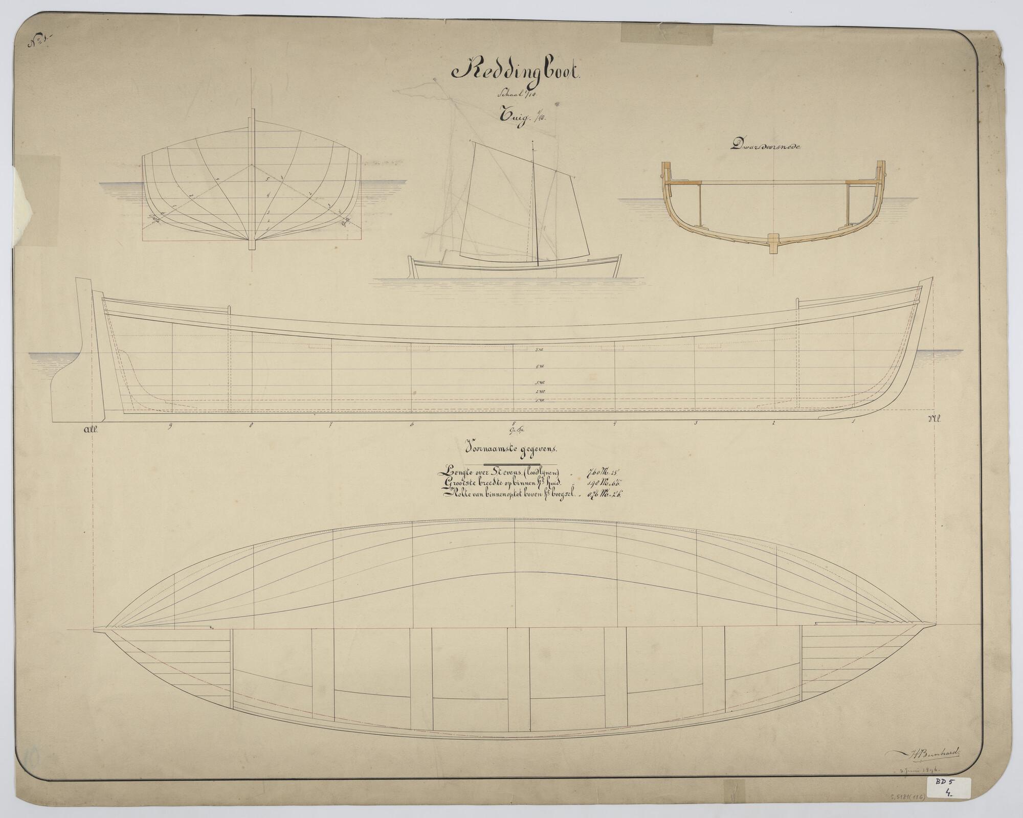 Lijnenplan van een overnaads gebouwde reddingboot.