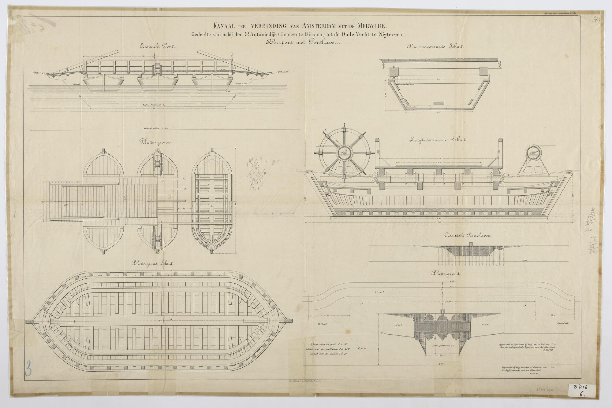 Zij- en bovenaanzichten en constructie van de veerpont met ponthaven in het kanaal dat Amsterdam verbindt met de Merwede, voor het gedeelte van St. Antoniedijk (gemeente Diemen) tot de Oude Vecht te Nigtevecht.
