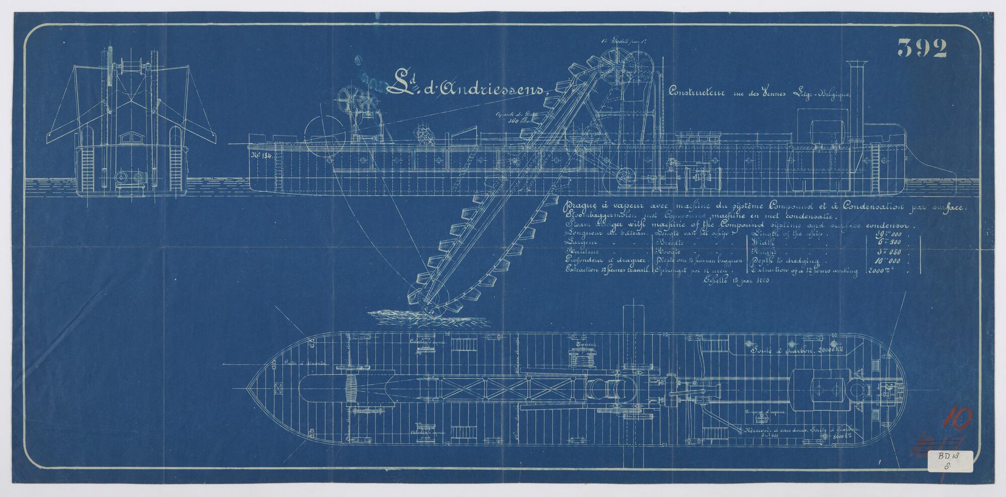 Algemeen plan van een baggermolen, met 10m baggerdiepte