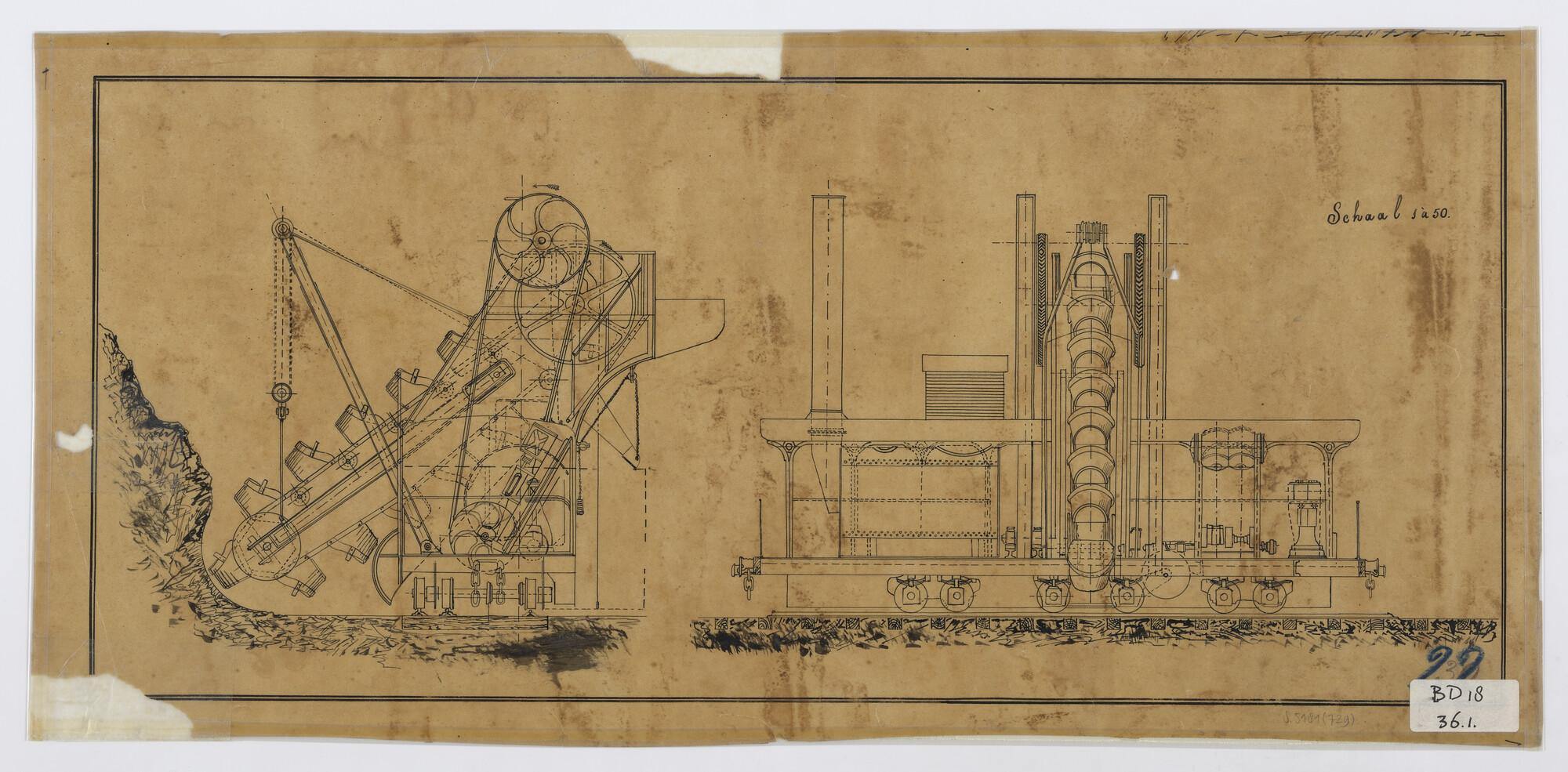 Plan van een Hollandse stoomlandbaggermolen op rails