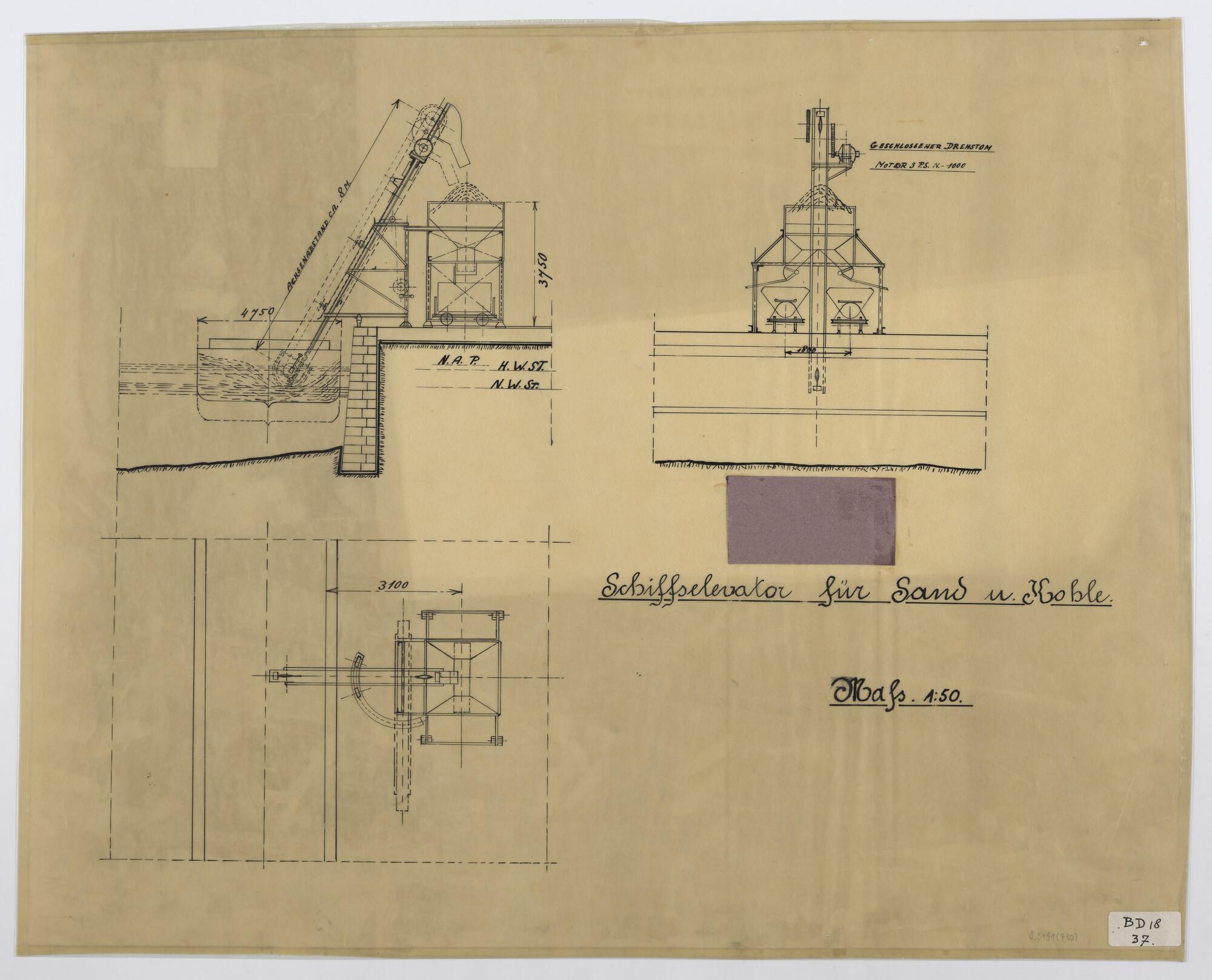 Algemeen plan van een havenscheepselevator voor zand en kolen.