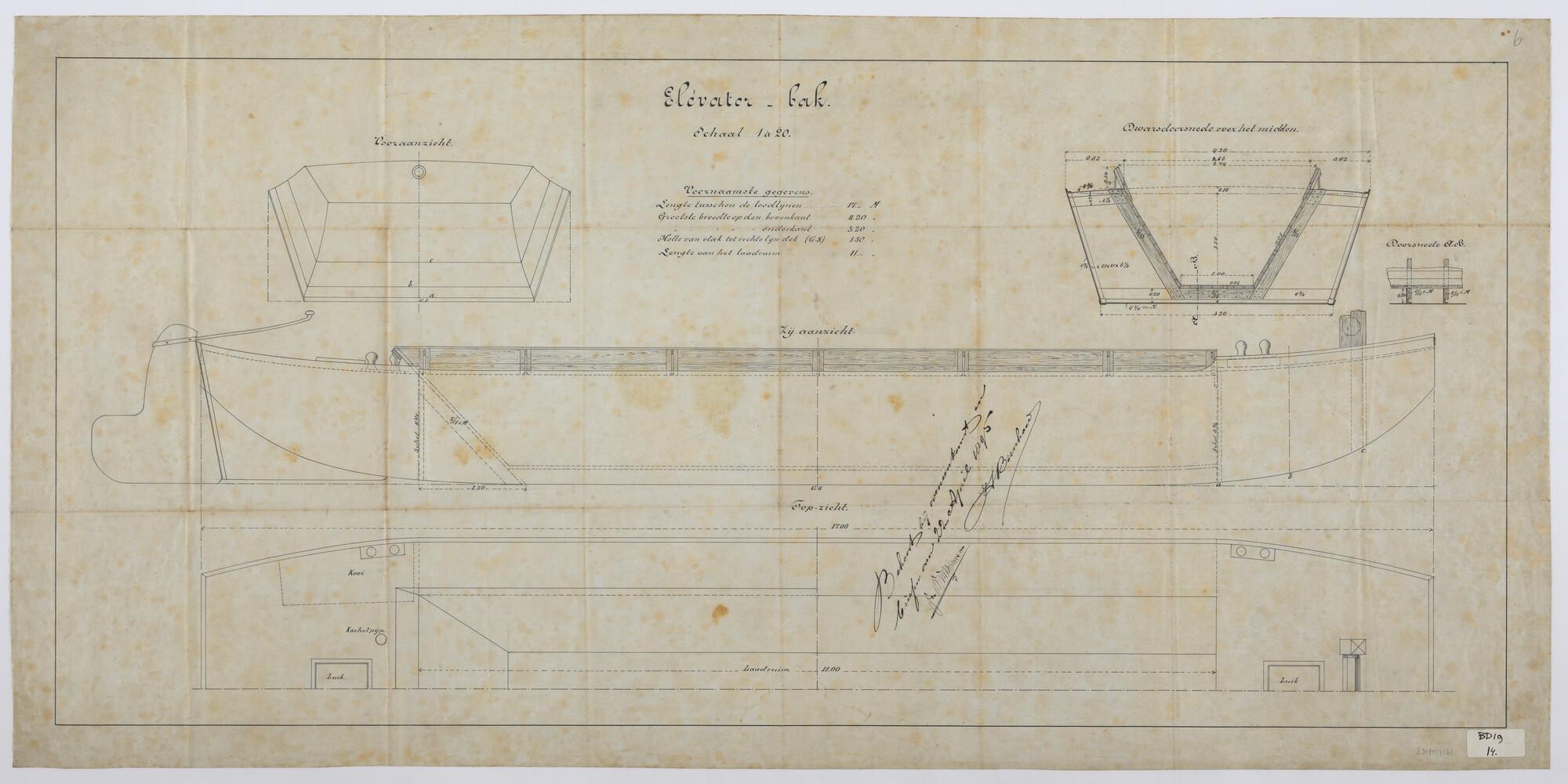 Algemeen plan van een ijzeren elevatorlosser met houten laadruimbekleding.
