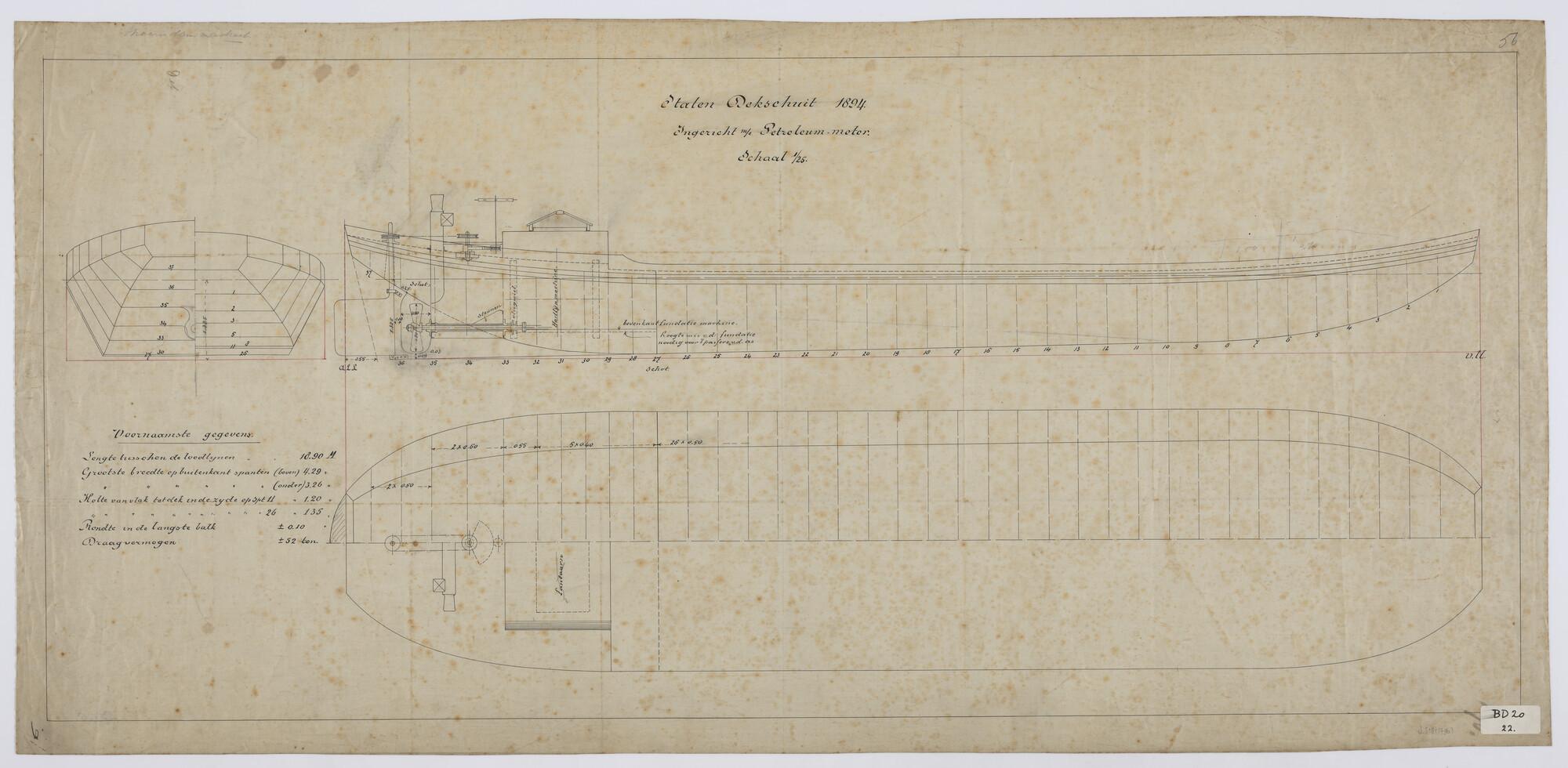 Algemeen plan van een stalen dekschuit met petroleummotor.