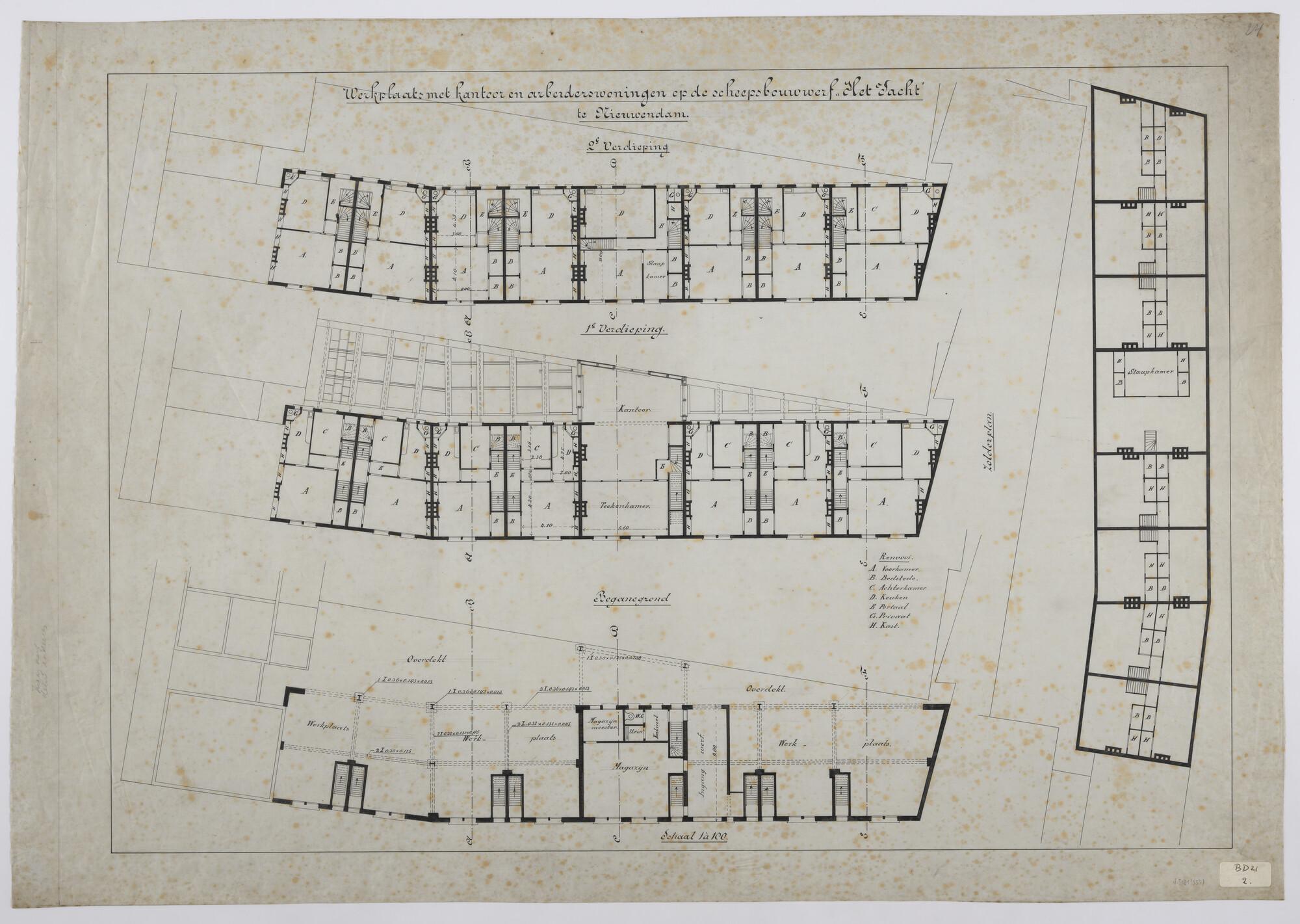 Begane grond, 1ste en 2de verdieping van kantoren en arbeiderswoningen op de werf Het Jacht te Nieuwendam.