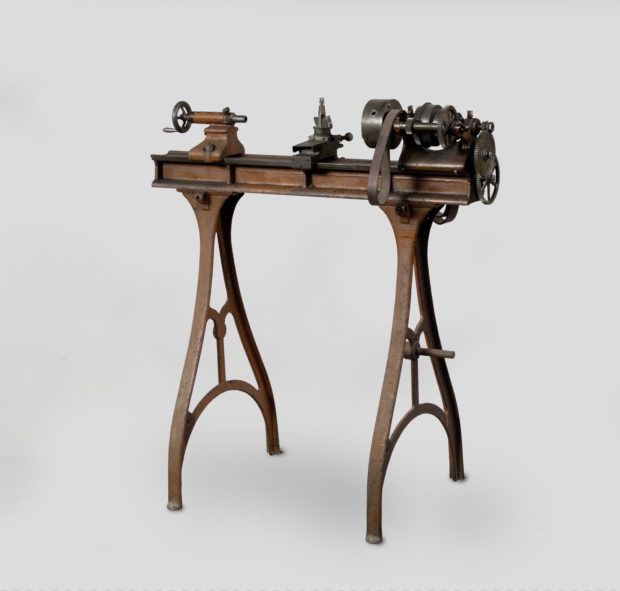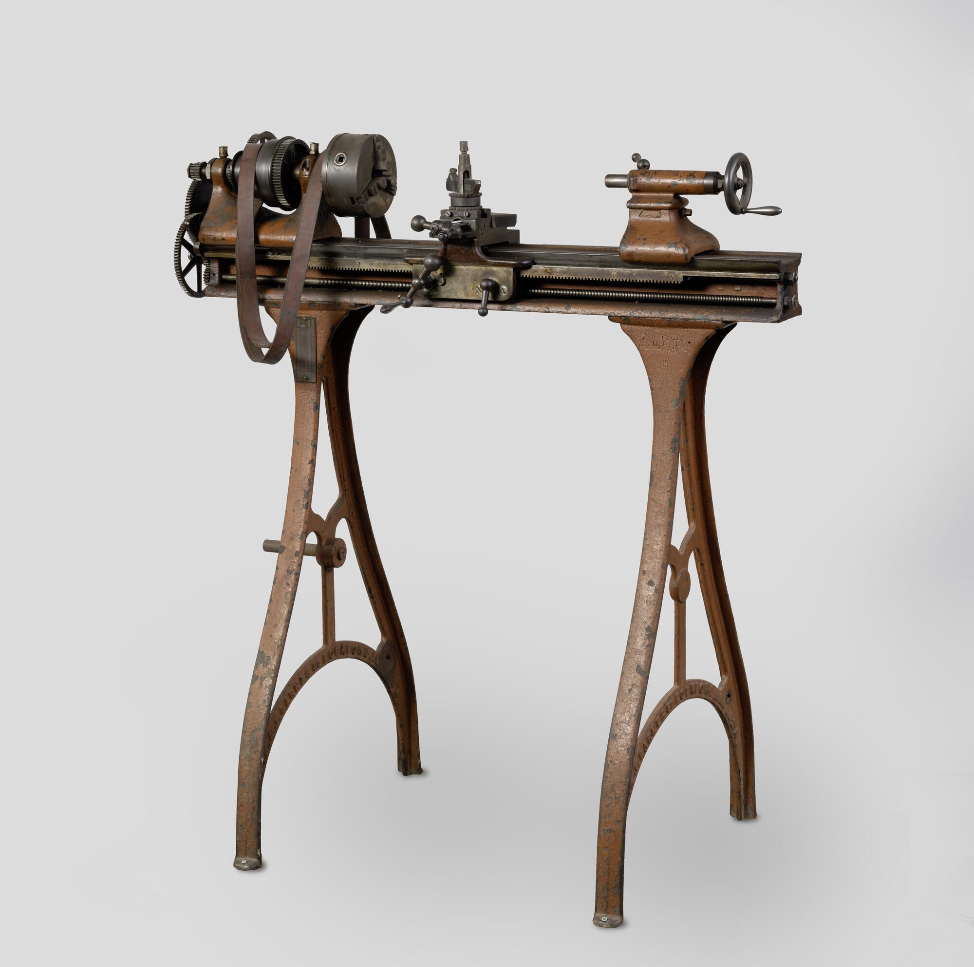 Draaibank, aangedreven d.m.v. riem [stoomwerktuigen]. Compleet met support en center. Geschilderd in Havanna bruin. Afkomstig van machinist-stoker B. Stins [zie objectgeschiedenis].