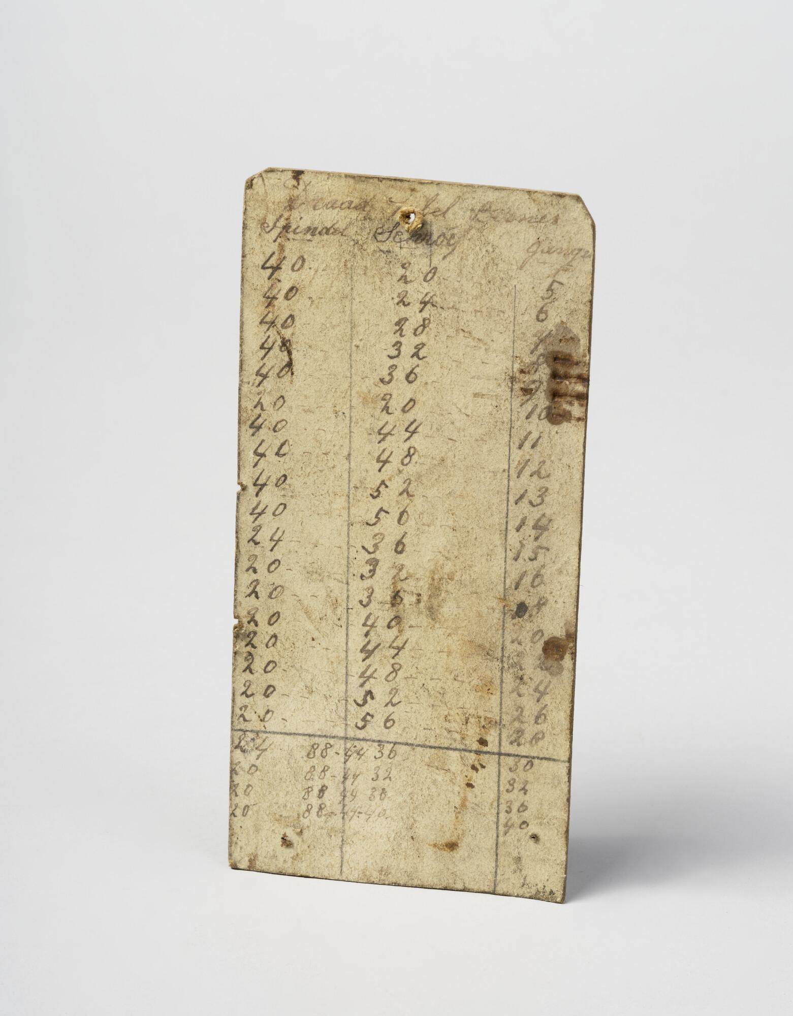 Tabel, handgeschreven op karton. O.a. met het aantal gangen per inch. Behorend bij draaibank S.5200(01).