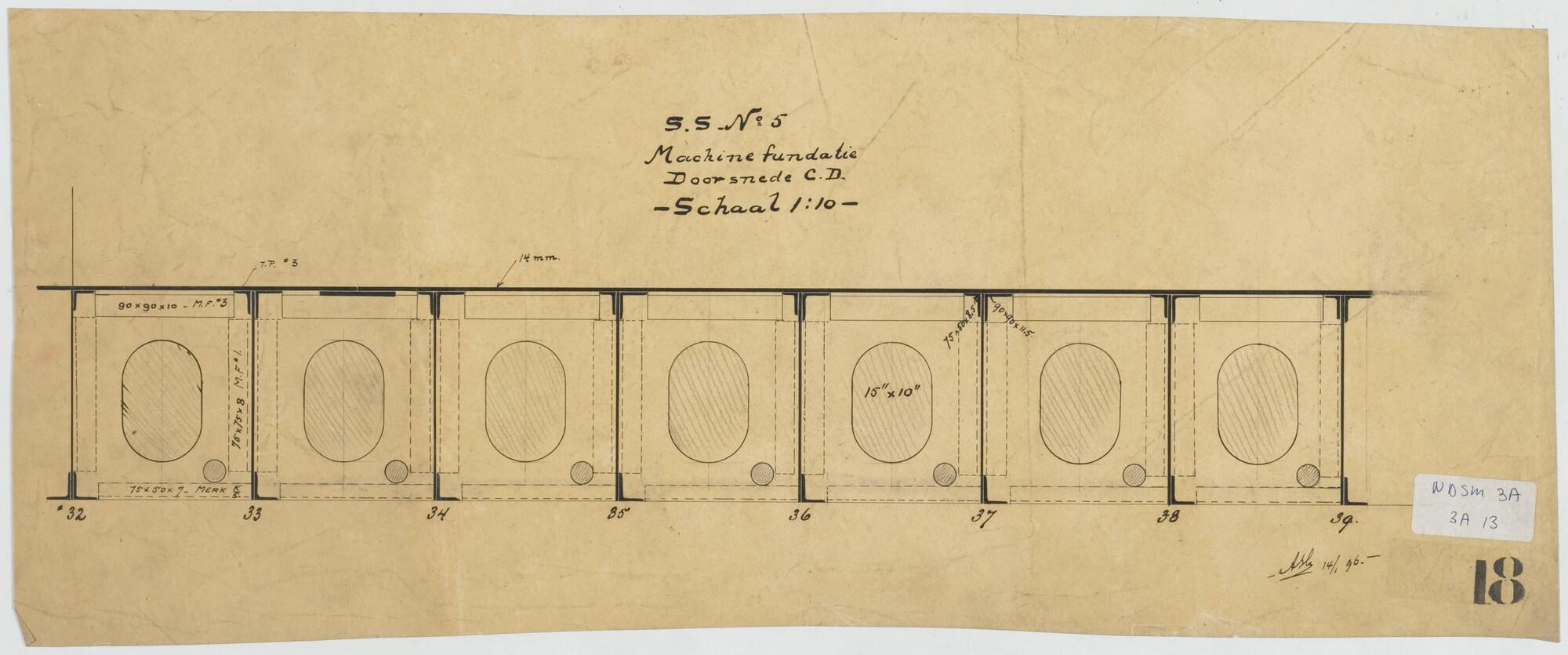 Machine fundatie, doorsnede, van vracht- en passagiersschip ss. Paramaribo voor het Departement van Koloniën.