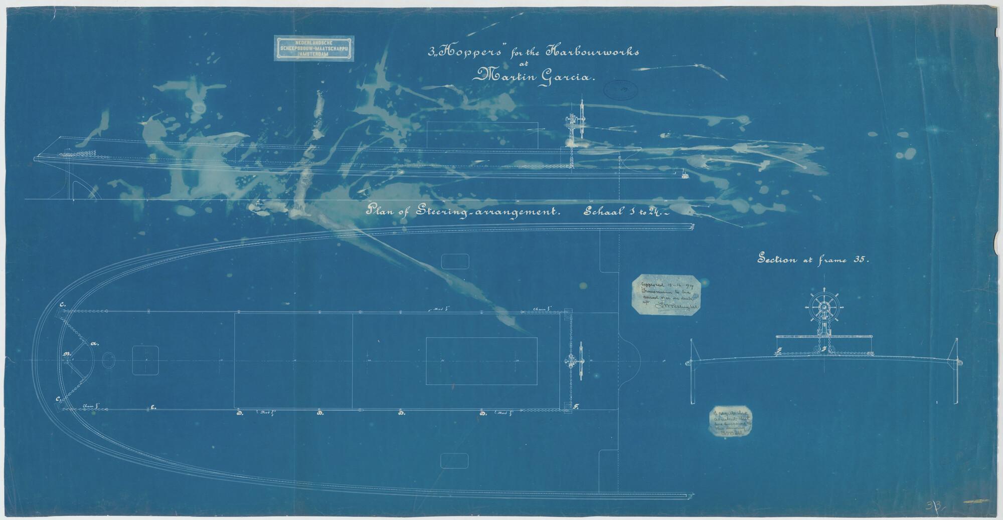 Overbrenging stuurwiel naar roer van de hoppers "Pantikopea", "Tanais", "Tanagoria", "Olivia", "Dioskuria", "Martin Garcia I", "Martin Garcia II" en "Martin Garcia III" voor Werf Conrad.