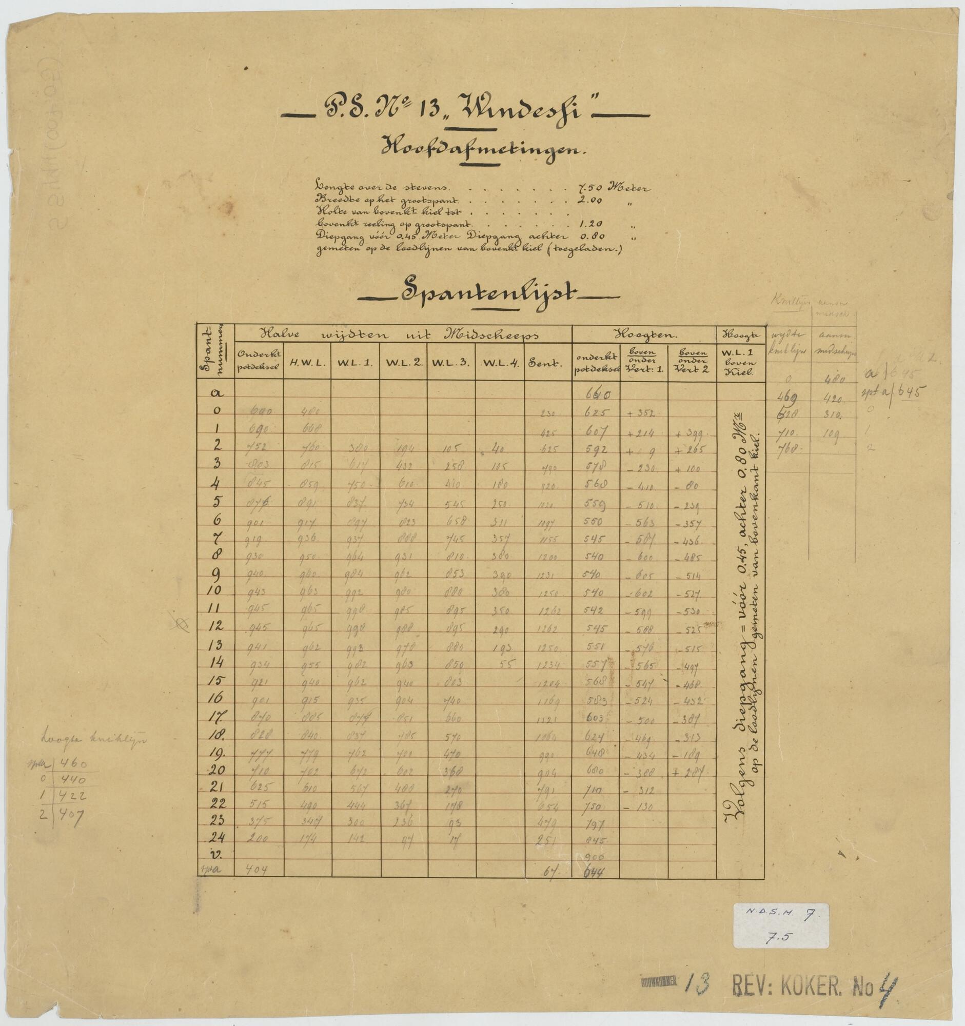 Spantenlijst van het motorbootje "Windettie".