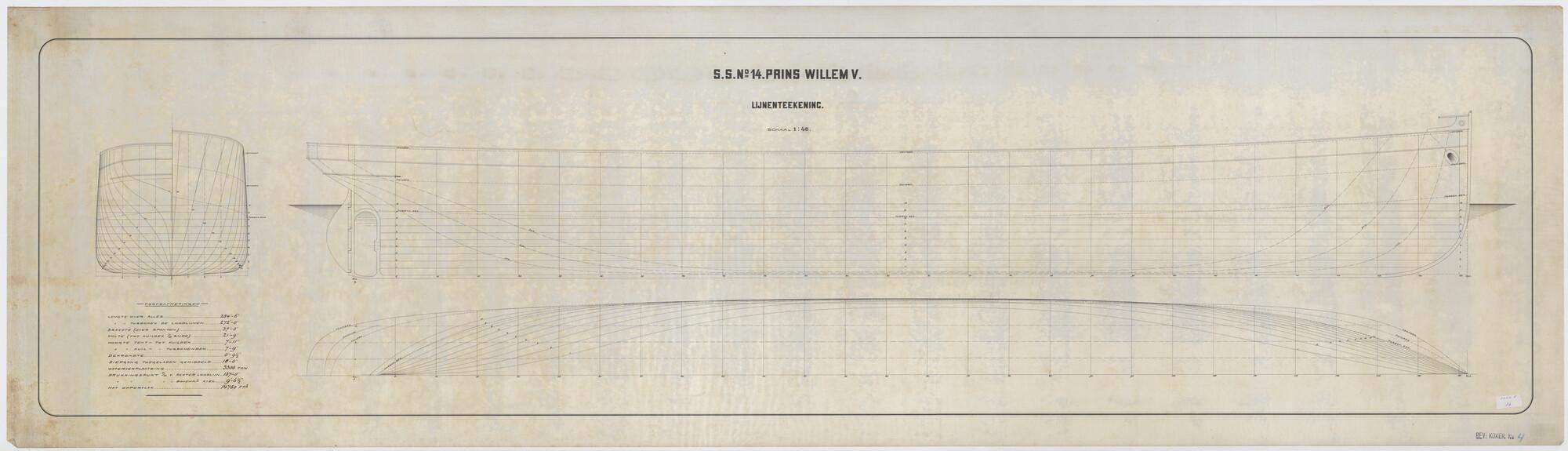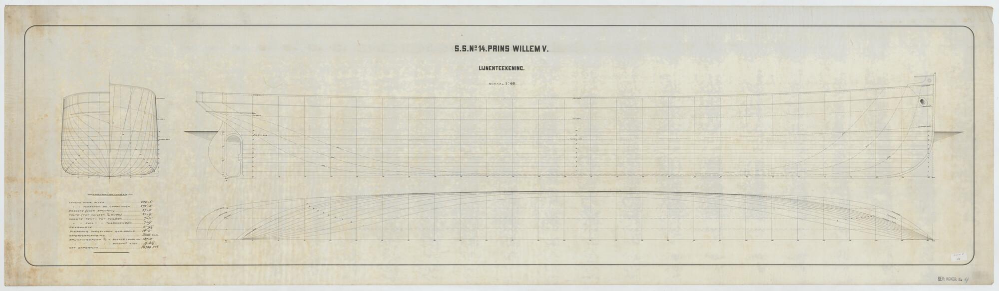 Lijnentekening van het passagiersschip ss. Prins Willem V voor de KWIM