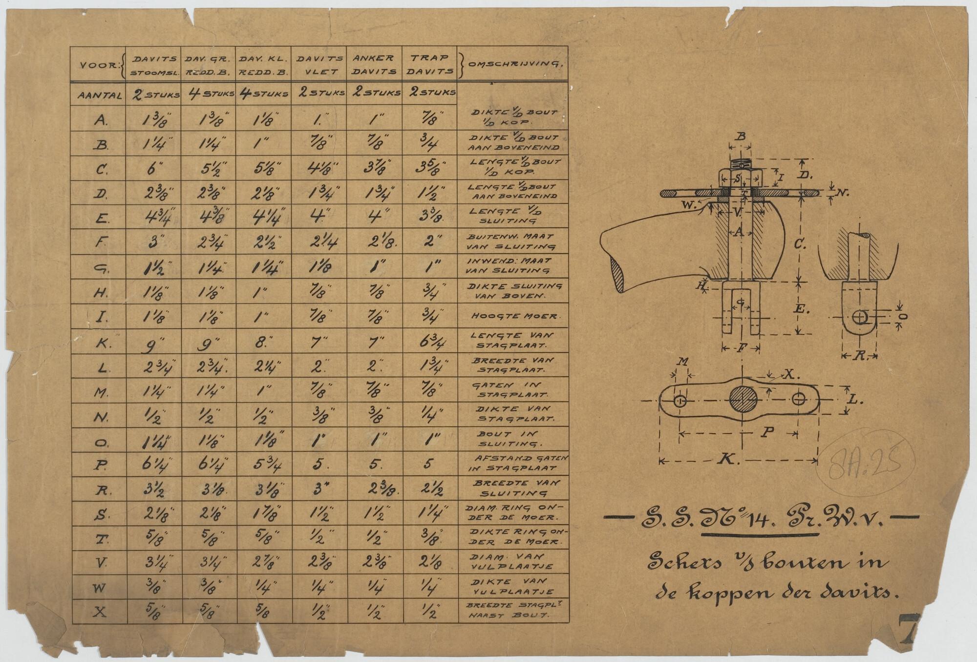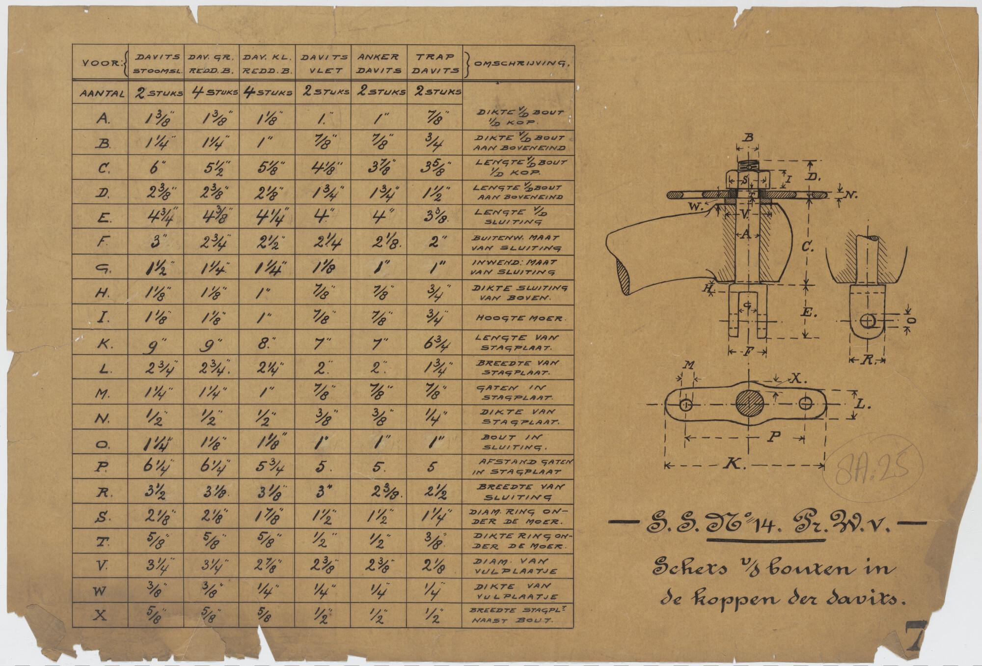 Schets van de bouten in de koppen der davits van de salon van het passagiersschip ss. Prins Willem V voor de KWIM