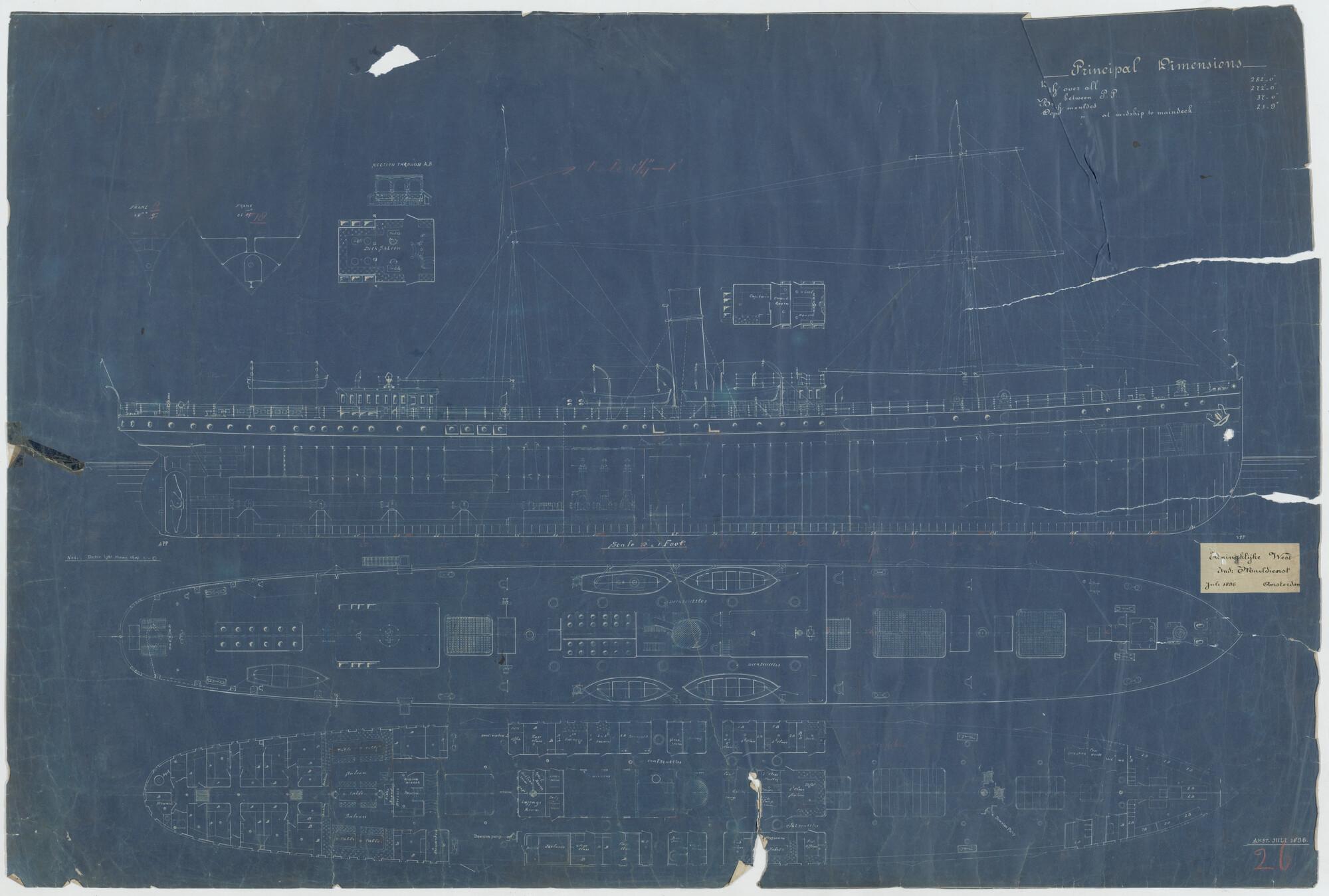 Zijaanzicht en dekplannen van het passagiersschip ss. Prins Willem V voor de KWIM.