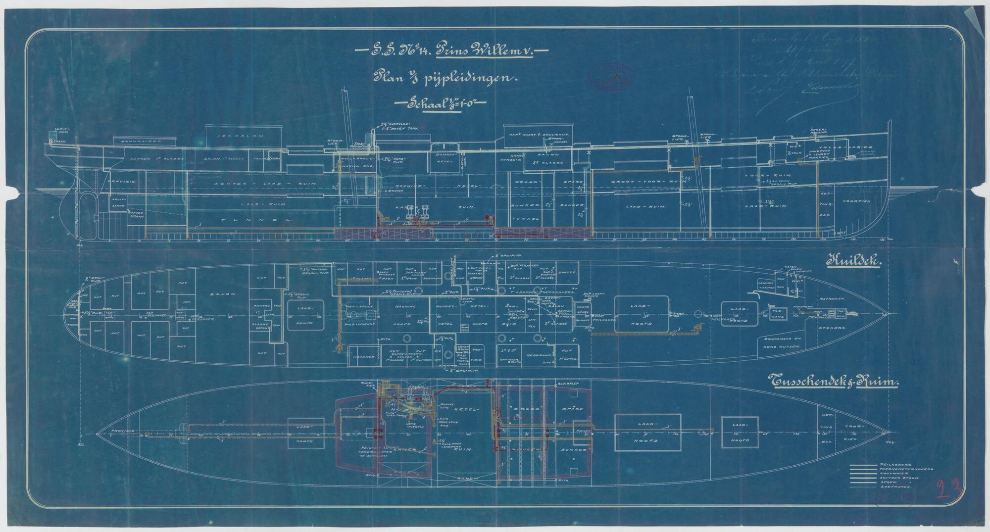 Plan van de pijpleidingen van het passagiersschip ss. Prins Willem V voor de KWIM.