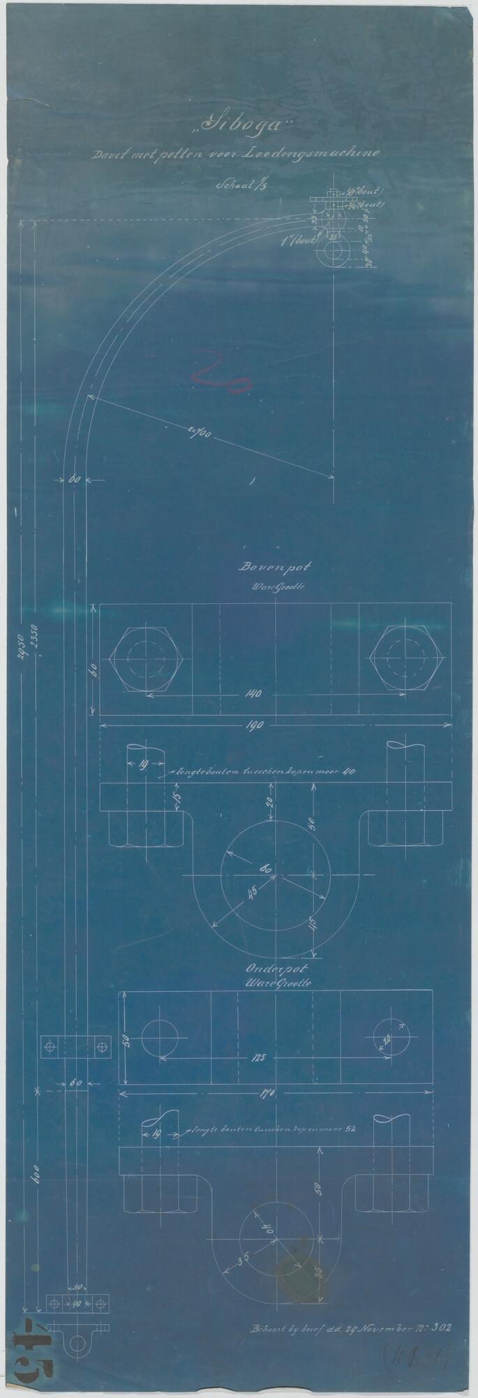 Davits met potten voor loodingsmachine van het flottieljevaartuig Hr.Ms. Koetei voor het Departement van Marine.