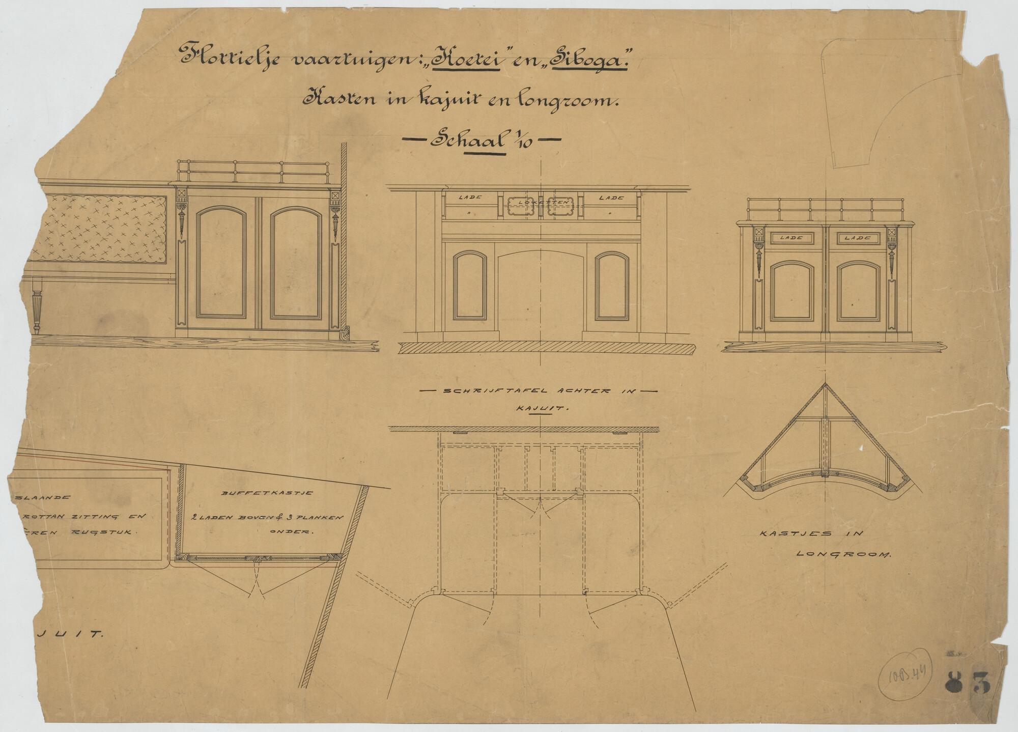 Kasten in kajuit en longroom van het flottieljevaartuig Hr.Ms. Koetei voor het Departement van Marine.