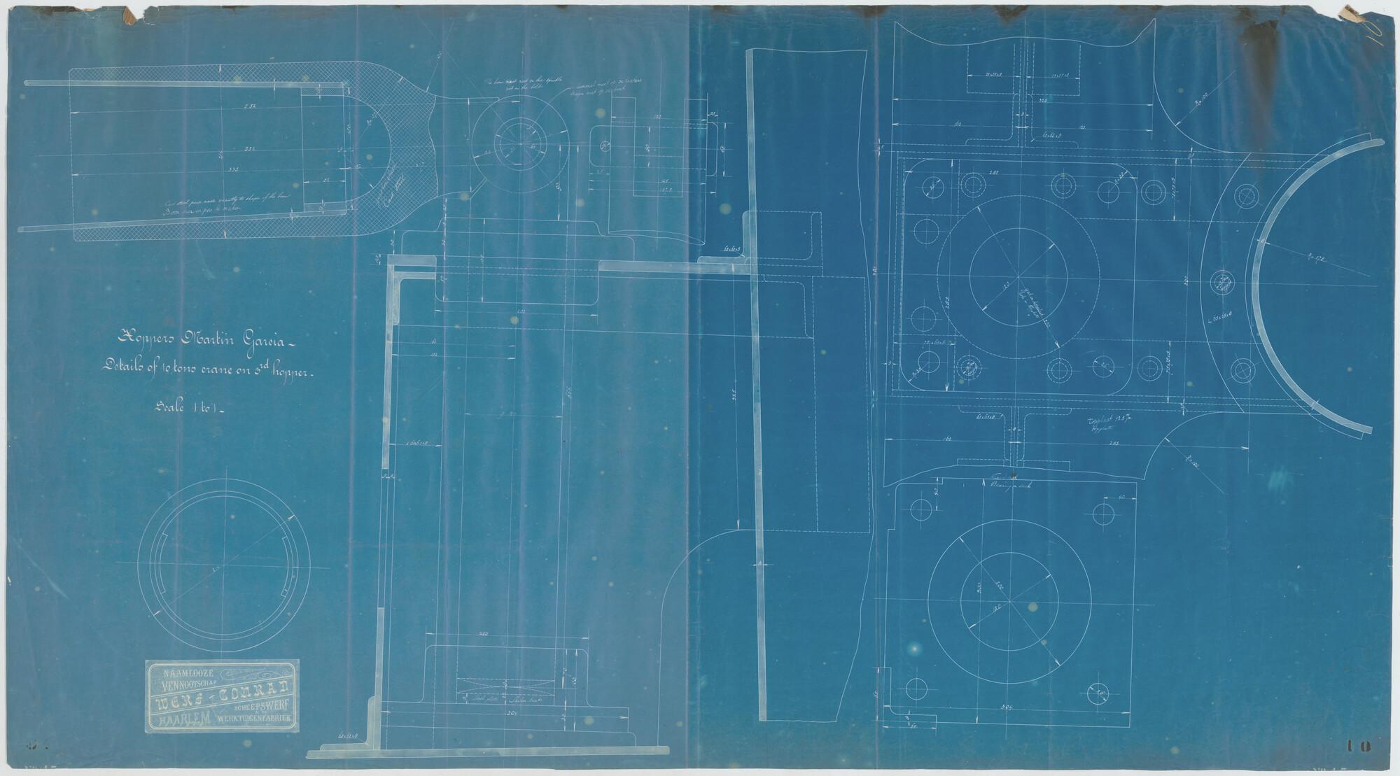 Details van 10 tons kraan (op de derde hopper) van de hoppers "Pantikopea", "Tanais", "Tanagoria", "Olivia", "Dioskuria", "Martin Garcia I", "Martin Garcia II" en "Martin Garcia III" voor Werf Conrad.