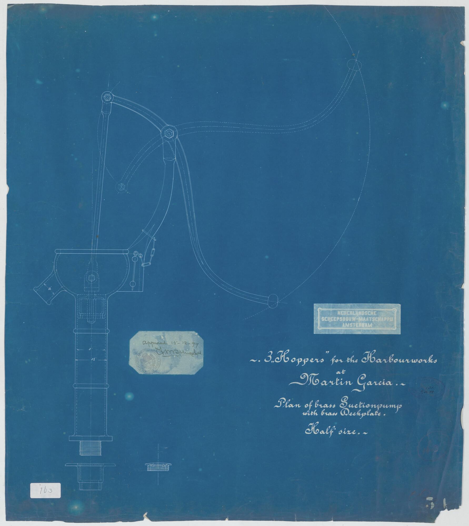 Bronzen zuigpomp mat bronzen dekplaat van de hoppers "Pantikopea", "Tanais", "Tanagoria", "Olivia", "Dioskuria", "Martin Garcia I", "Martin Garcia II" en "Martin Garcia III" voor Werf Conrad.