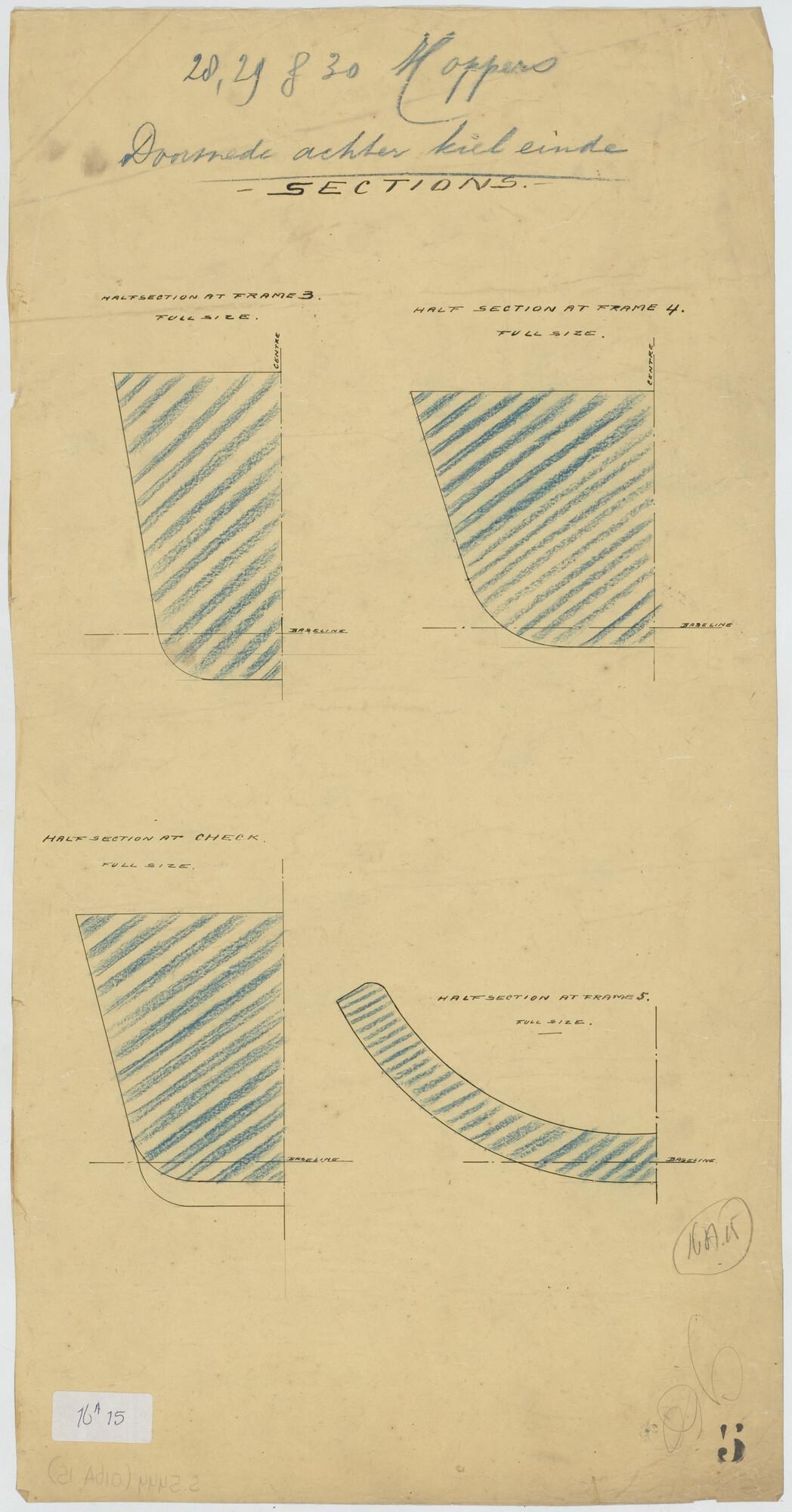 Doorsneden van de hoppers "Pantikopea", "Tanais", "Tanagoria", "Olivia", "Dioskuria", "Martin Garcia I", "Martin Garcia II" en "Martin Garcia III" voor Werf Conrad.