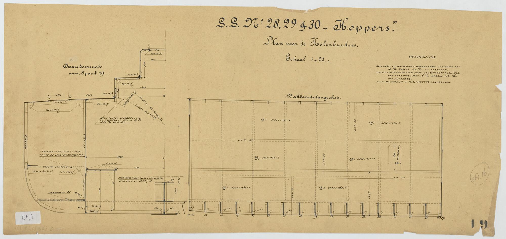Plan voor de kolenbunkers van de hoppers "Pantikopea", "Tanais", "Tanagoria", "Olivia", "Dioskuria", "Martin Garcia I", "Martin Garcia II" en "Martin Garcia III" voor Werf Conrad.