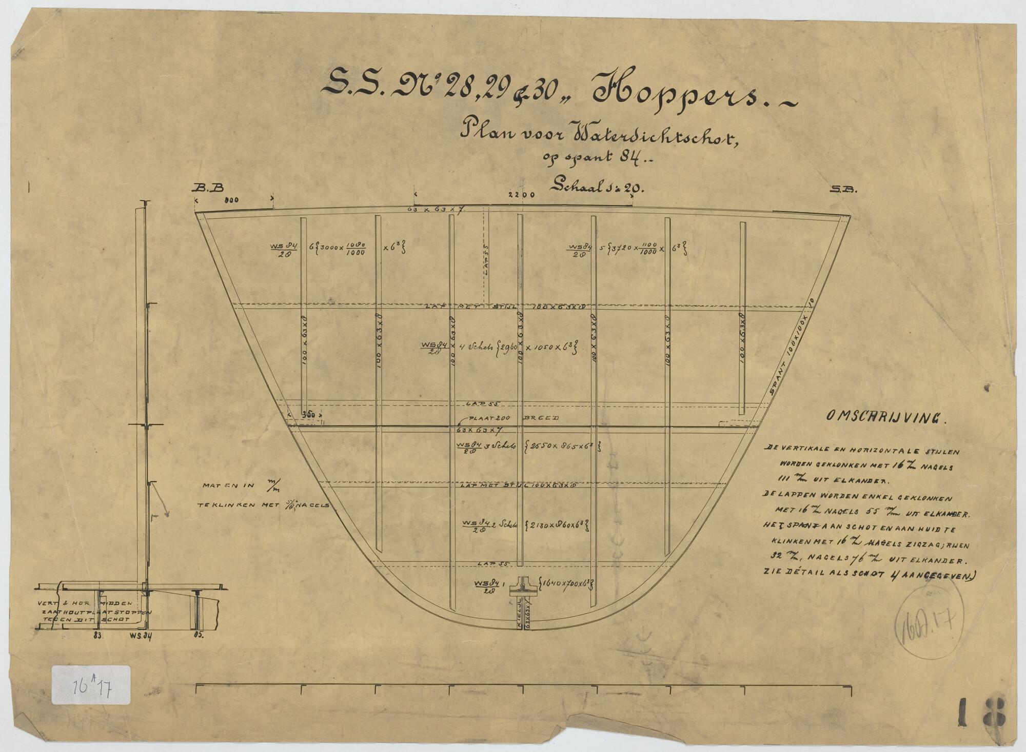 Plan voor waterdicht schot op spant 84 van een hopperzuiger