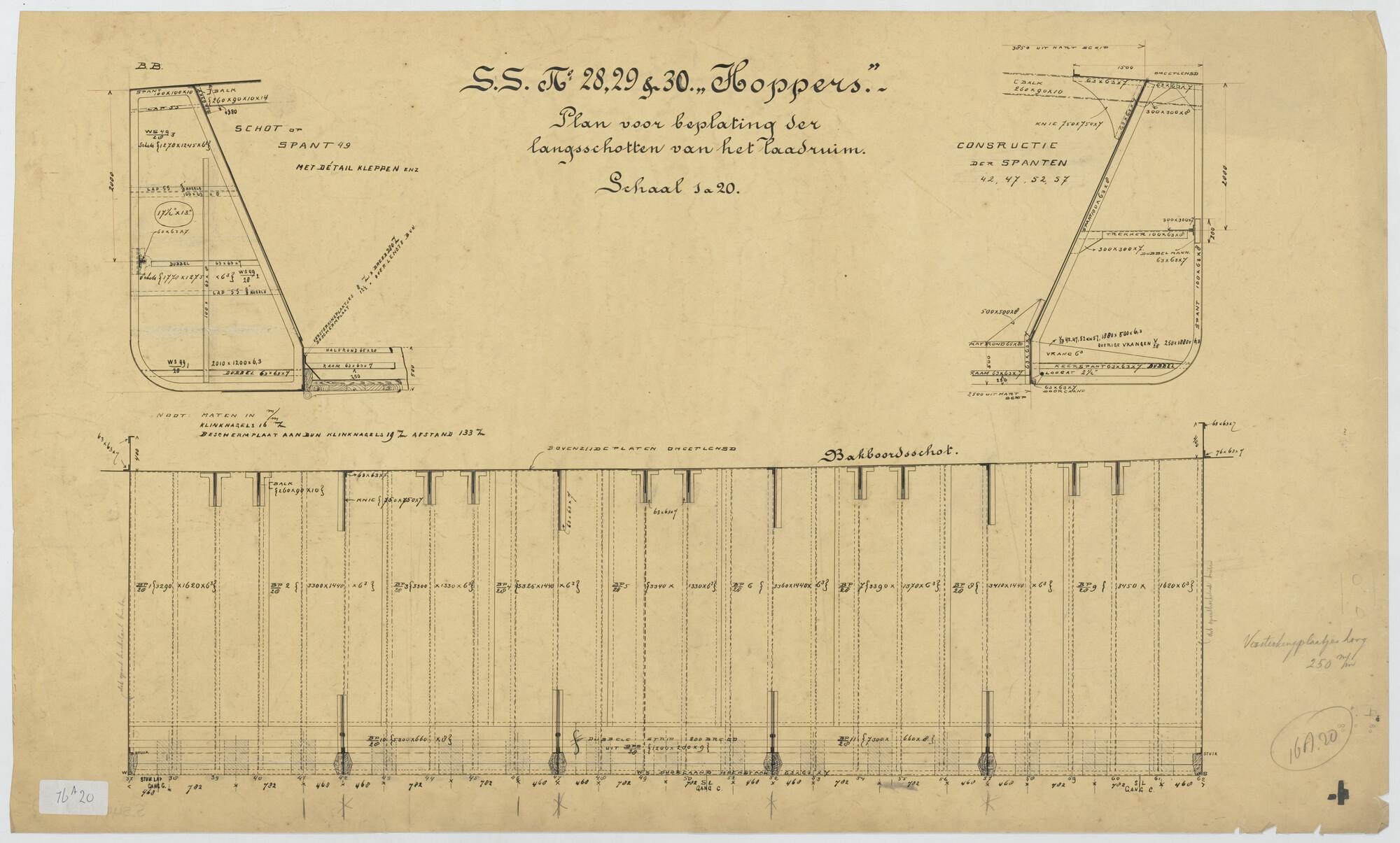 Plan voor beplating der langsschotten van het laadruim van de hoppers "Pantikopea", "Tanais", "Tanagoria", "Olivia", "Dioskuria", "Martin Garcia I", "Martin Garcia II" en "Martin Garcia III" voor Werf Conrad.