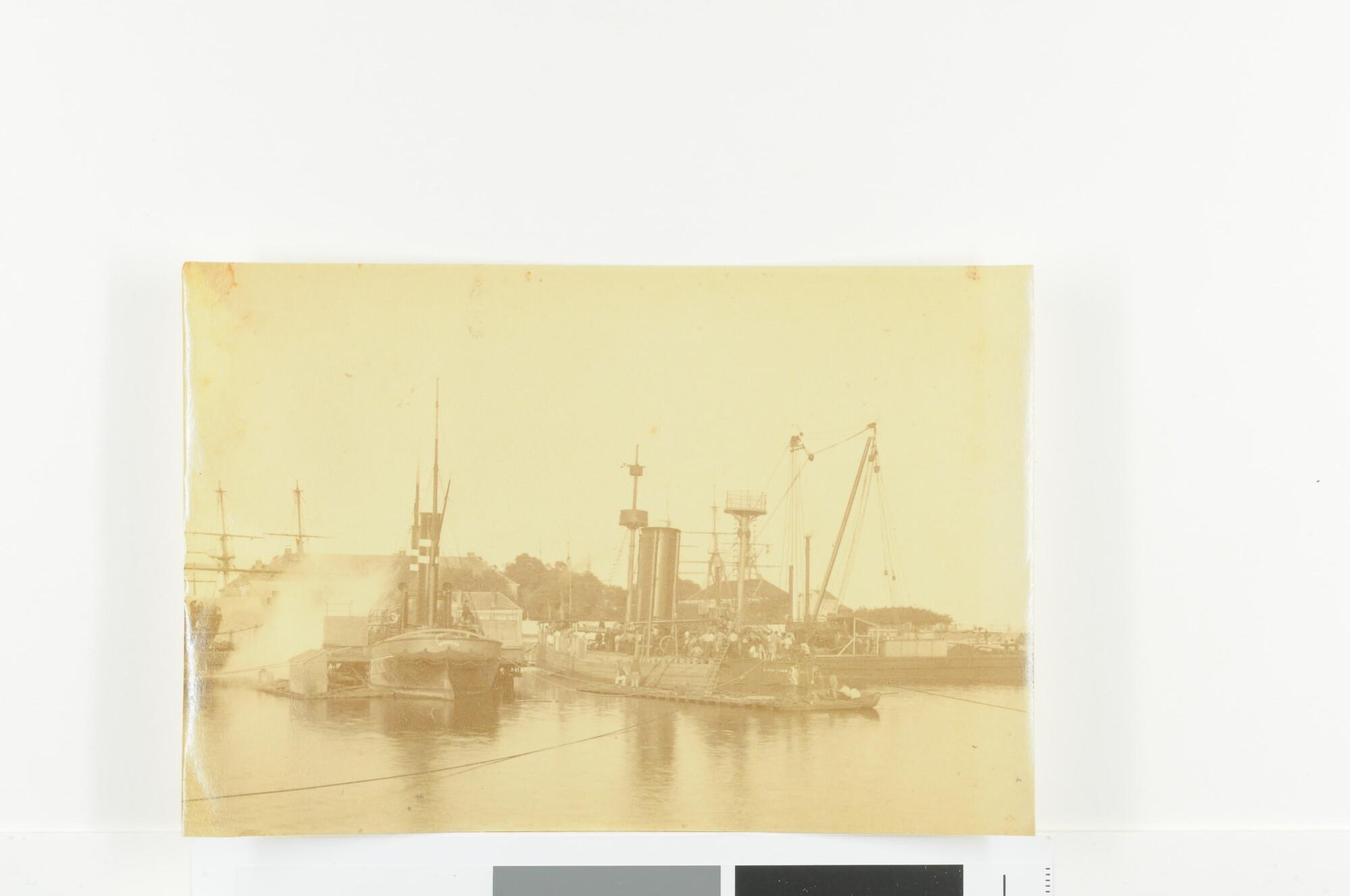 Het lichten van het pantserschip Hr.Ms. "Schorpioen" nadat het schip is gezonken in het natte dok van Willemsoord. Links ligt de raderstoomsleepboot "Hercules", september 1886.