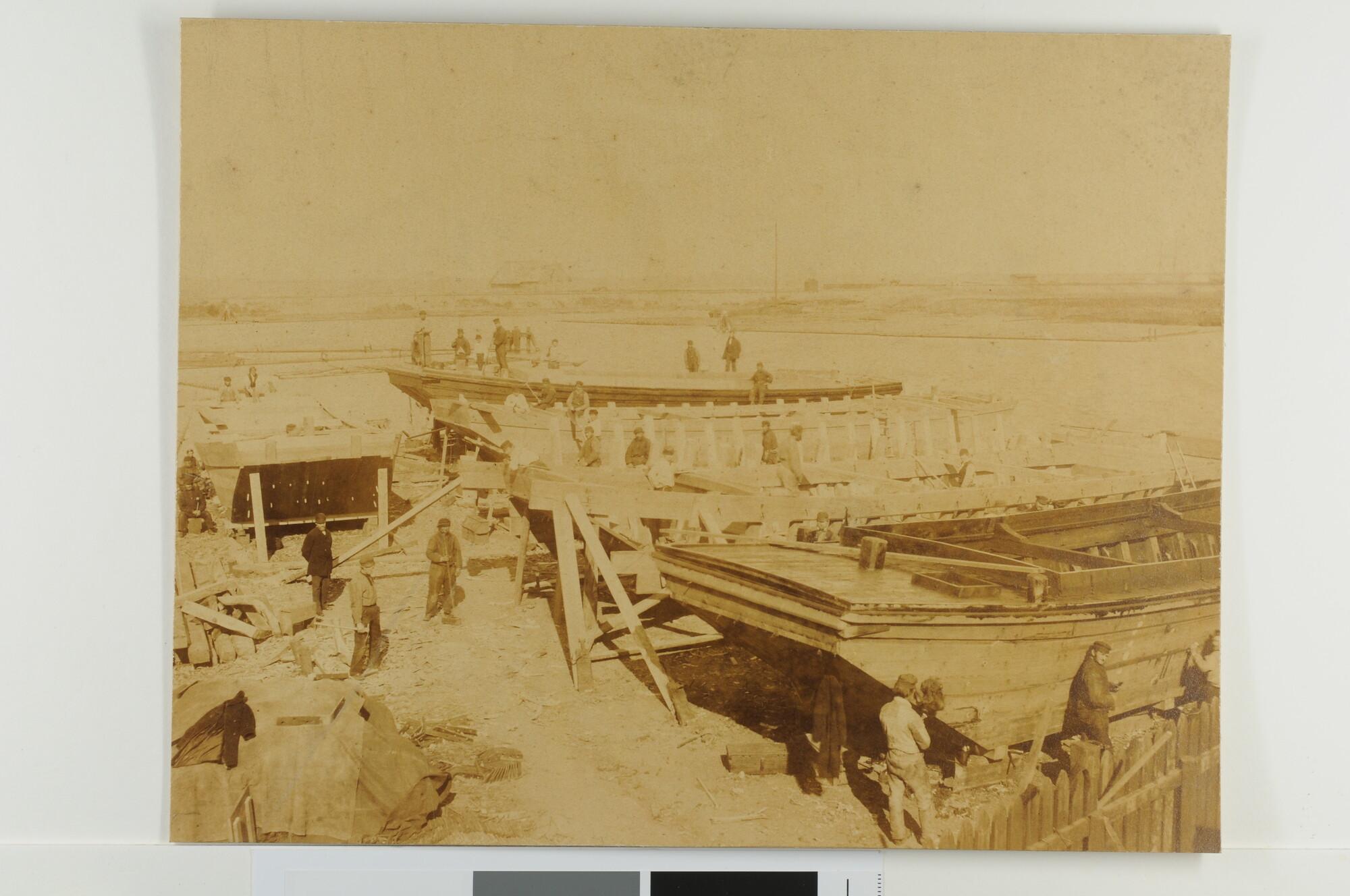 Gezicht op scheepswerf 'Het Jacht' aan de Lijbaansgracht te Amsterdam met in aanbouw zijnde houten dekschuiten, omstreeks 1890.