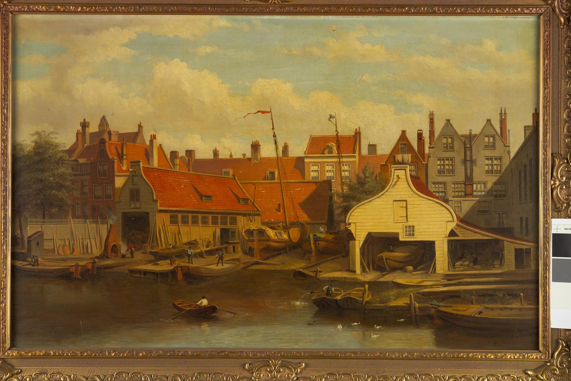 Kopie van het schilderij De werf Het Jagt aan de Lijnbaansgracht te Amsterdam door Eduard Alexander Hilverdink. Op de linker scheepshelling ligt een spiegeljacht en elders op de werf en in het water liggen verschillende platbodems.