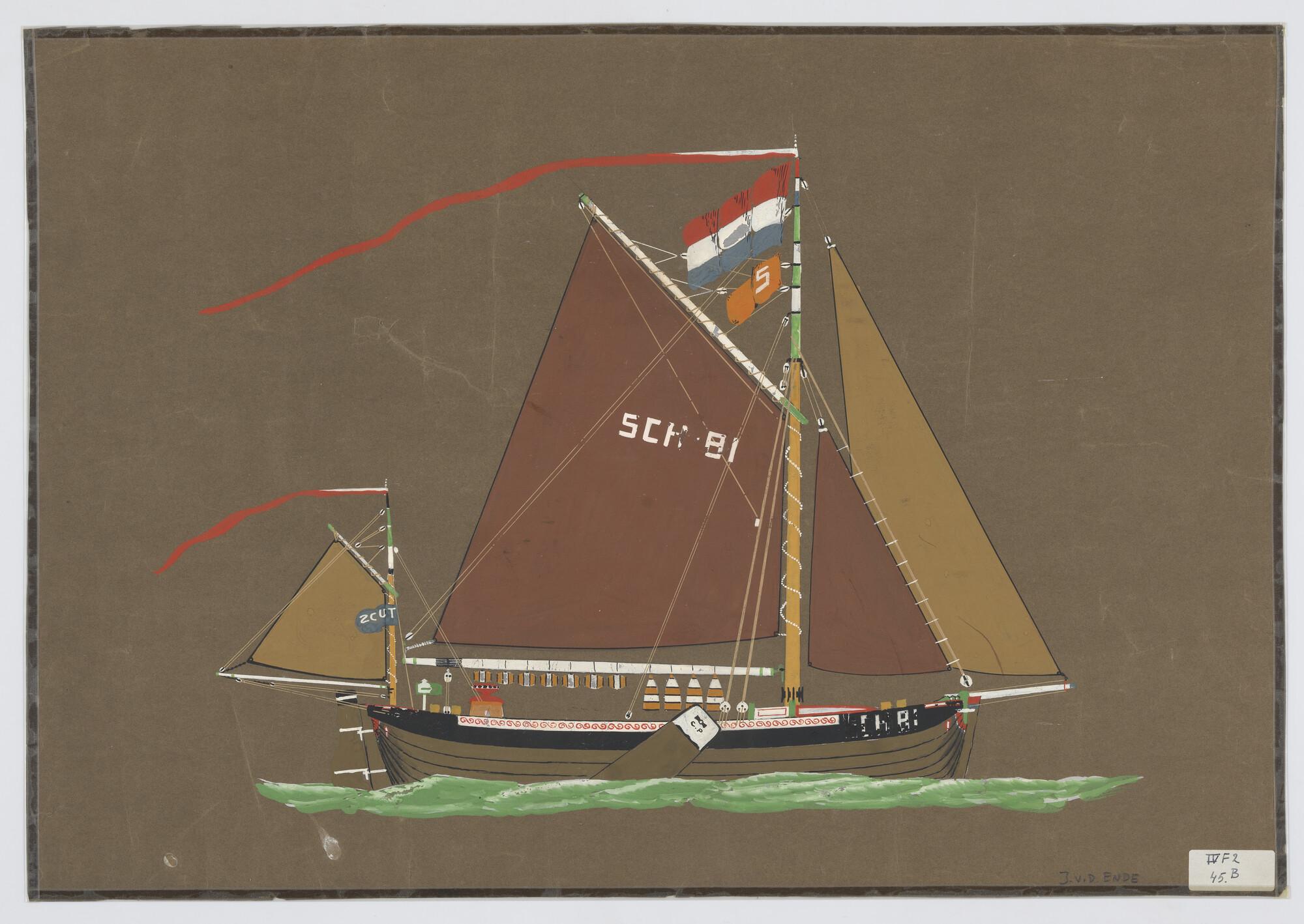 Reconstructie tekeningen van Scheveningse bomschuiten SCH 124 en SCH 328 (1896): Zijaanzicht, verticale langsdoorsnede, dwarsdoorsnede, vooraanzicht, achteraanzicht, zijaanzicht (Zeilen gehesen).