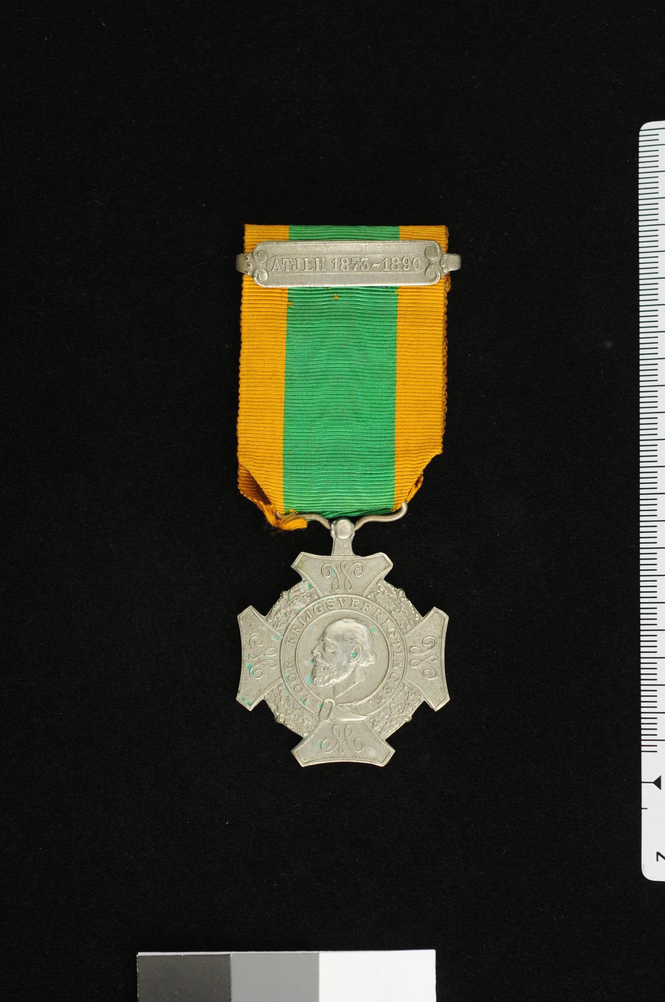Ereteken voor Belangrijke Krijgsbedrijven, ook wel Expeditiekruis of Kruis voor Krijgsverrichtingen genoemd, met gesp "Atjeh 1873-1890". Uitgereikt aan 3e stuurman G.W.E. Esche, 1892
