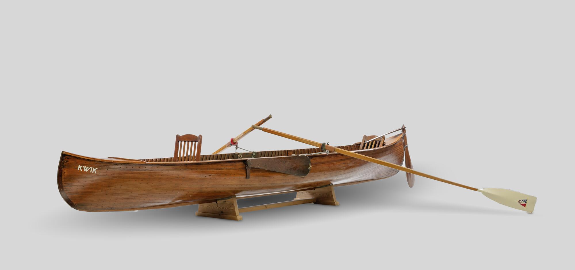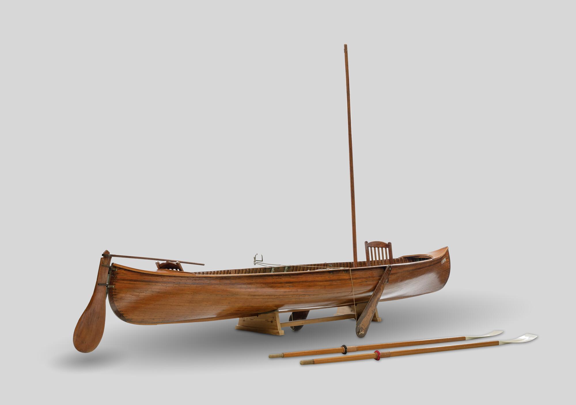Eenpersoons outrigged C1, Canadese kano 'Kwik' met zeiltuig.