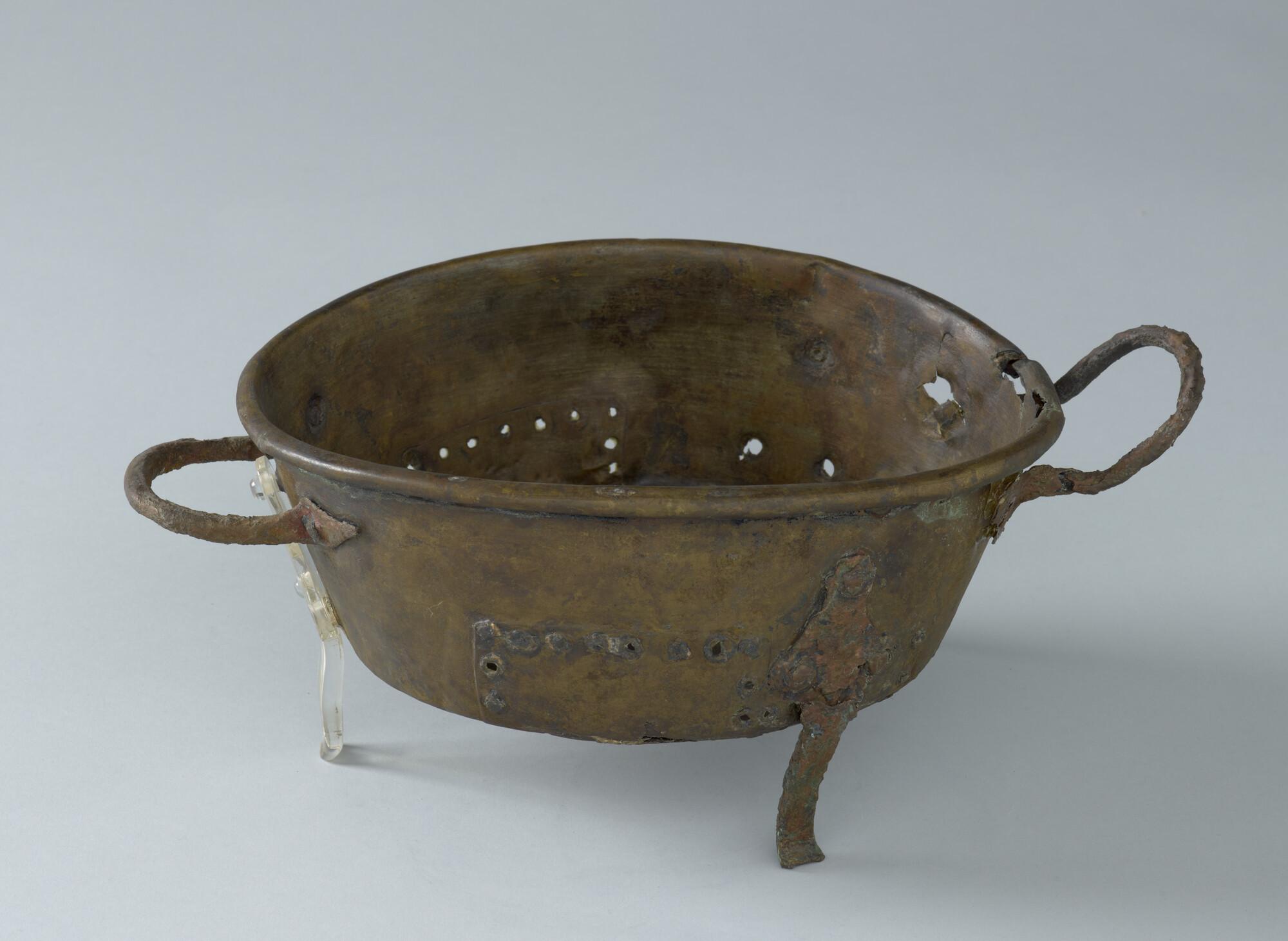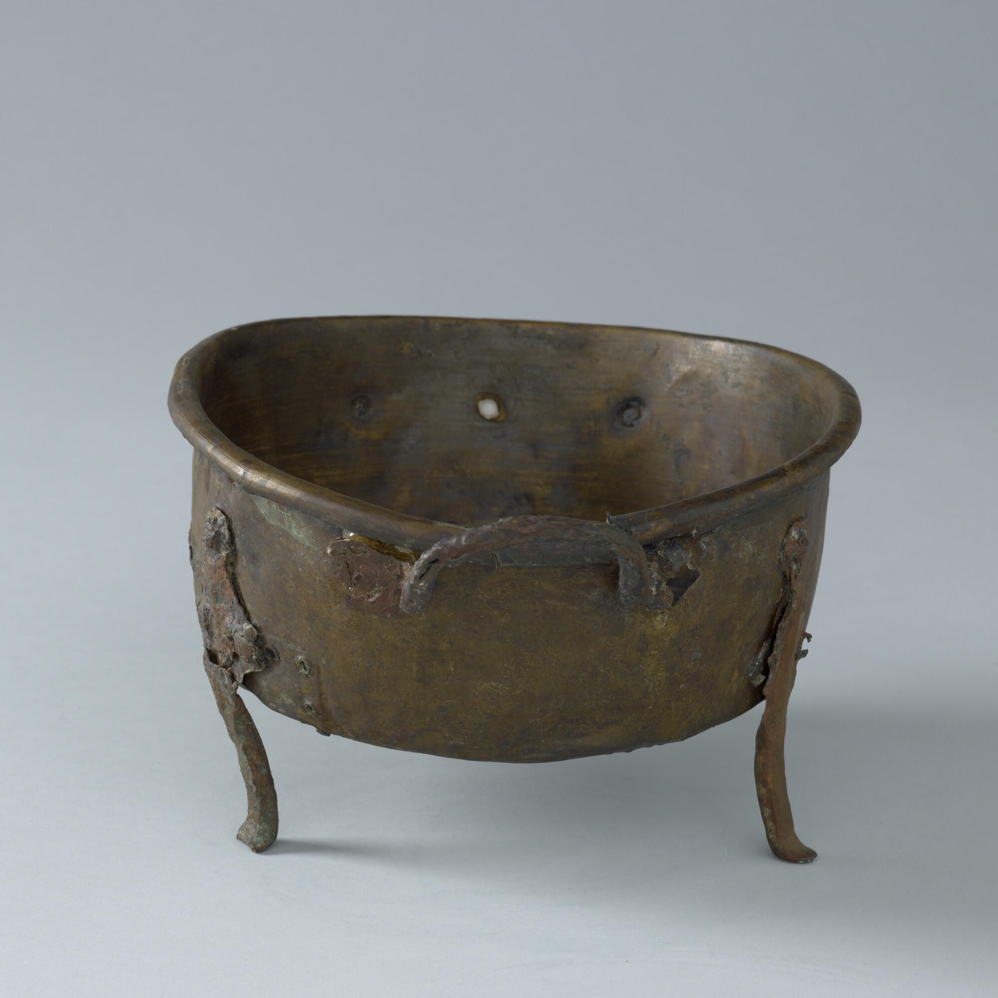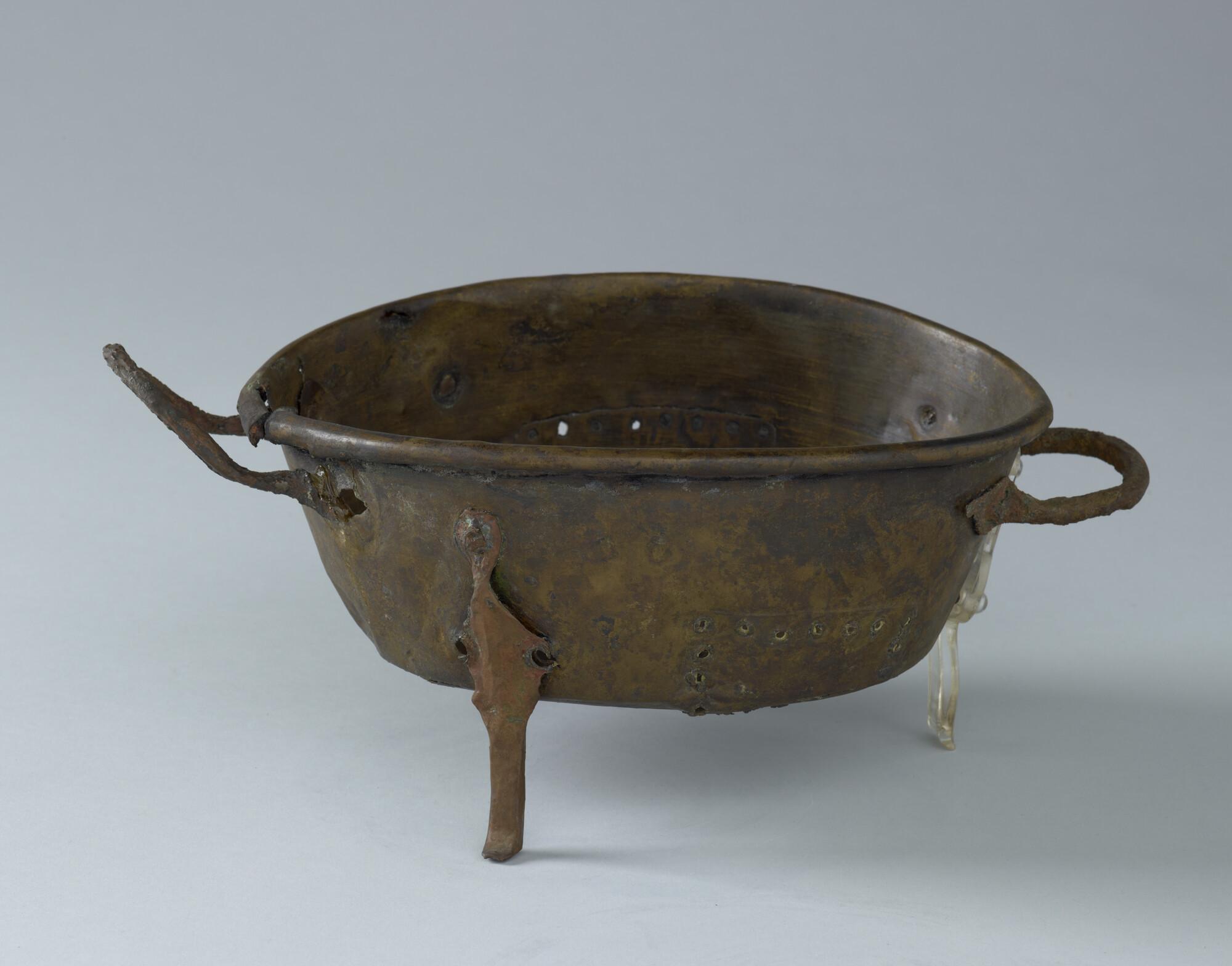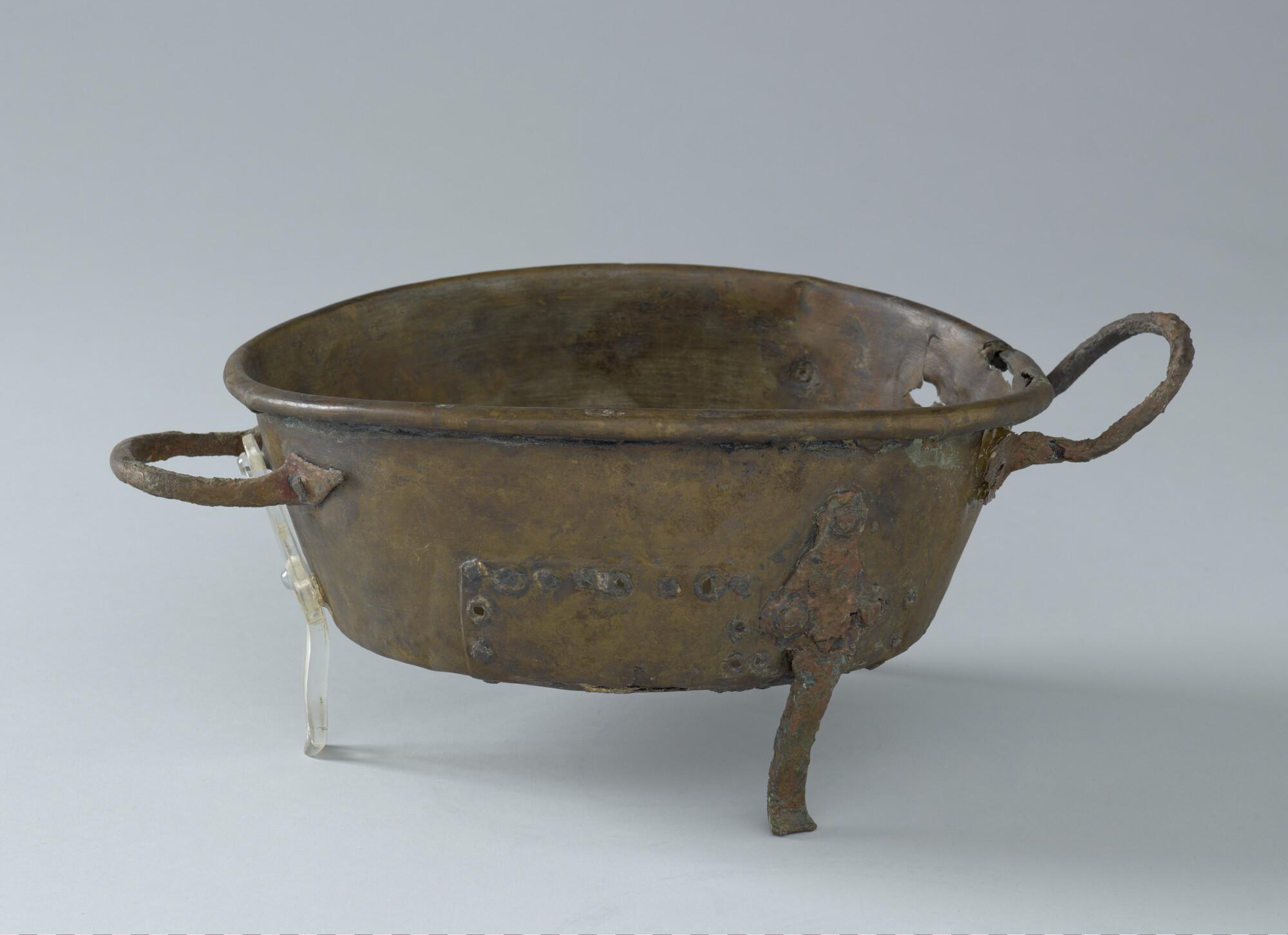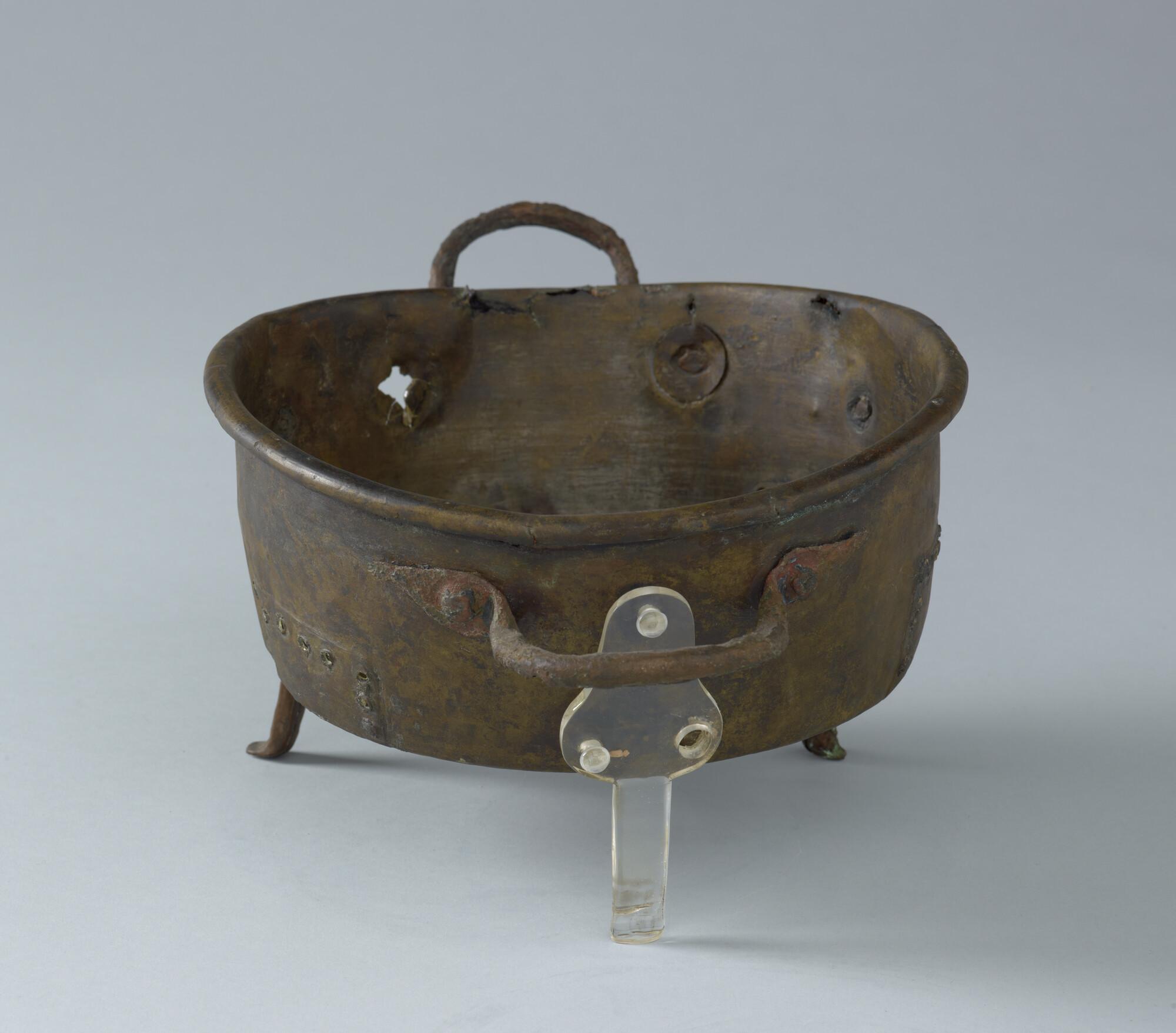 Pan op drie pootjes en met twee handgrepen. De pan is op drie plaatsen in de tijd gerepareerd. Afkomstig uit het wrak van de 'Hollandia', vergaan in 1743.
