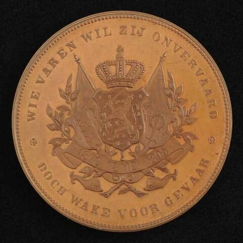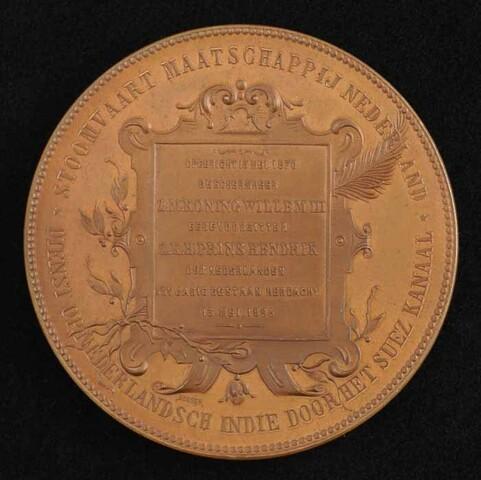 Bronzen herdenkingspenning, geslagen op het vijfentwintig-jarig bestaan van de Stoomvaart-Maatschappij "Nederland" (SMN) op 13 mei 1895. Deze penning werd door de stoomvaartmaatschappij aan het personeel ten geschenke gegeven.