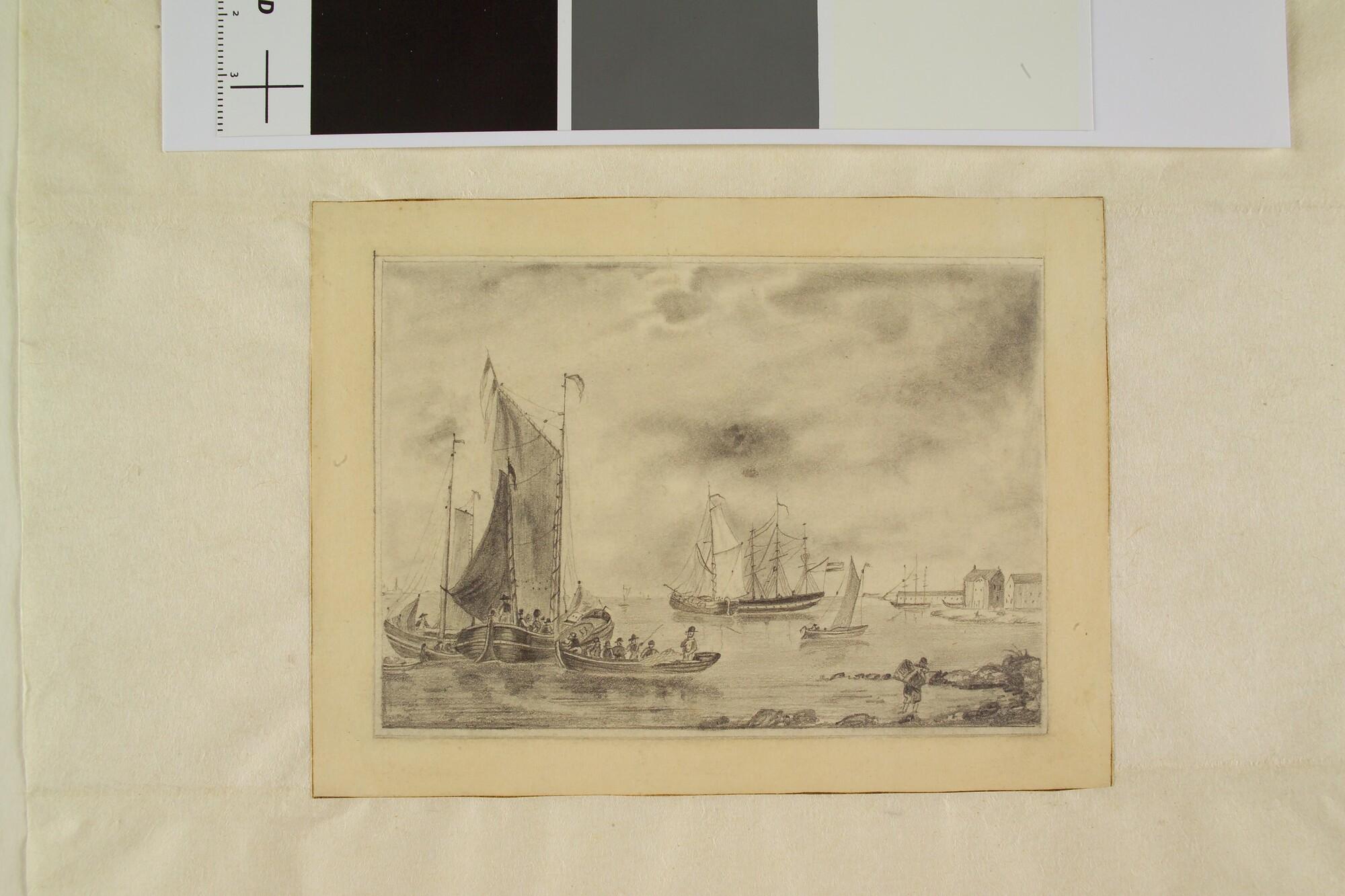 Tekening van een rede met een beurtschip en een sloep met passsagiers en andere schepen. Rechts gebouwen aan het water.