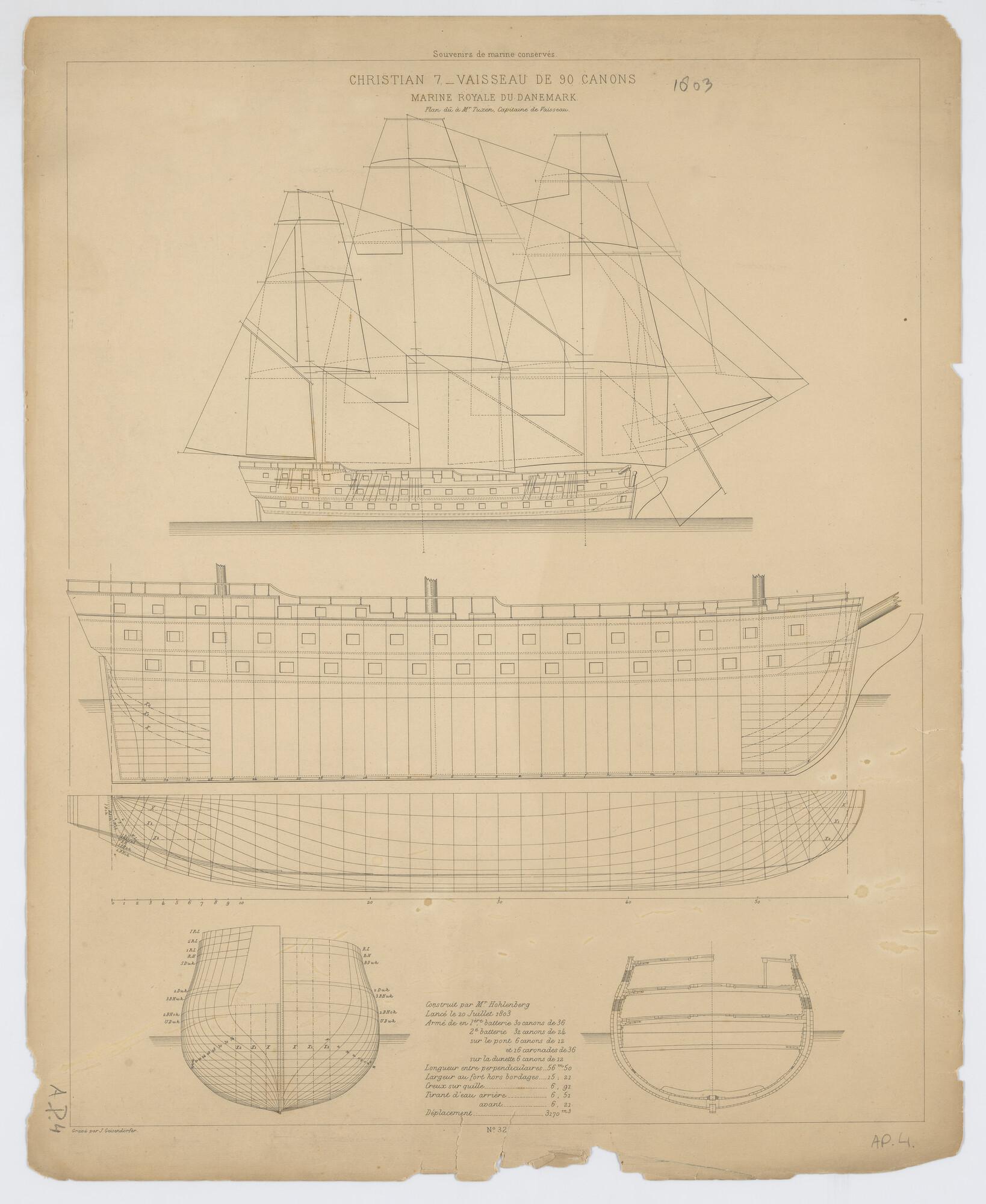 Prent Souvenirs de marine conservés met dank aan kapitein ter zee Tuxen van zijaanzicht van het Deense (Royal Danish-Norwegian Navy) fregat Christian Den VII (1805-1807) met 90 stukken en drie geschutdekken. Gebouwd door Kohlenberg (Hohlenberg). Afmetingen: lengte 56.50 m, breedte 15.21 m, holte 6.91 m. Op de prent wordt als datum tewaterlating 20 juli 1803 ...