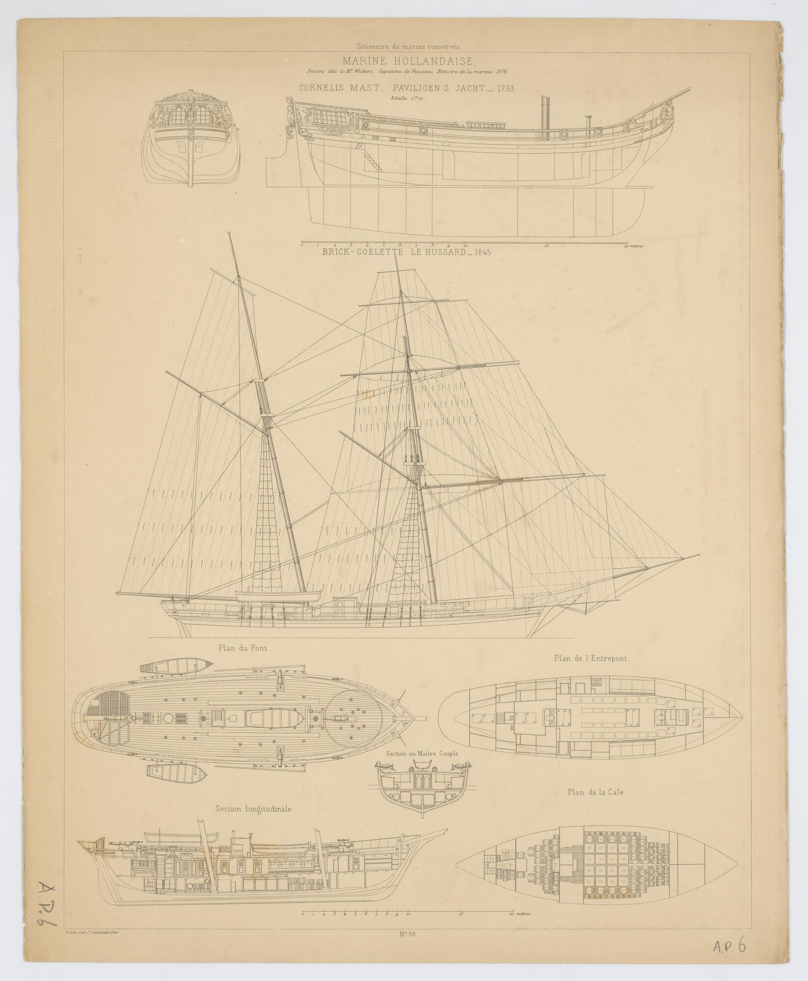 Prent Souvenirs de marine conservés - Marine Hollandaise van twee schepen o.m. van de Koninklijke marine, met dank aan kapitein ter zee H.O. Wichers (1831-1889) Minister van Marine (1877-1879). Het bovenste afgebeelde schip: Zijaanzicht en achteraanzicht van een paviljoenjacht uit 1733 (Cornelis Mast), afmetingen lengte w.l. 20 meter. Fraai bewerkte spiegel en zij-gallerij. Het onderste ...